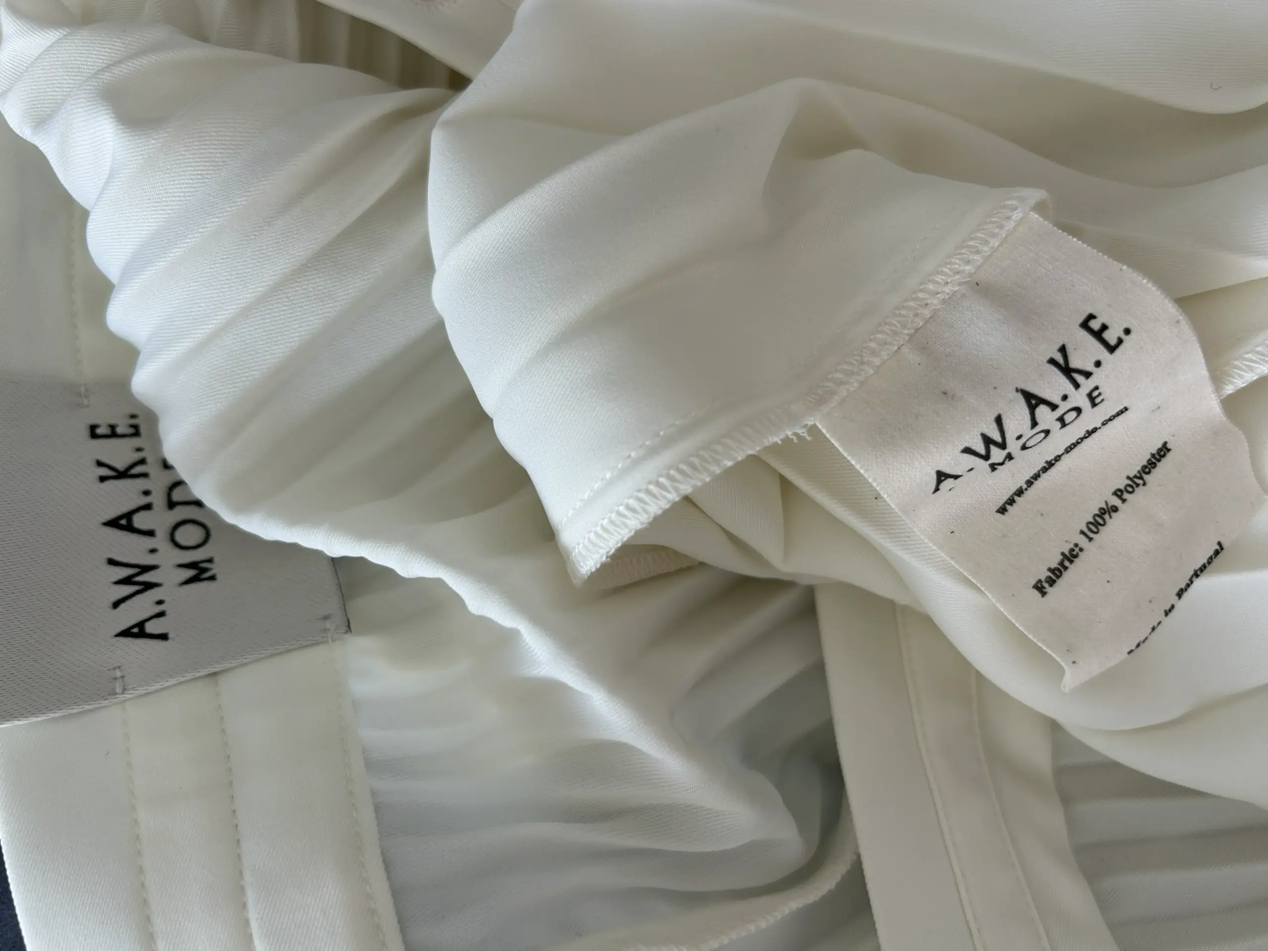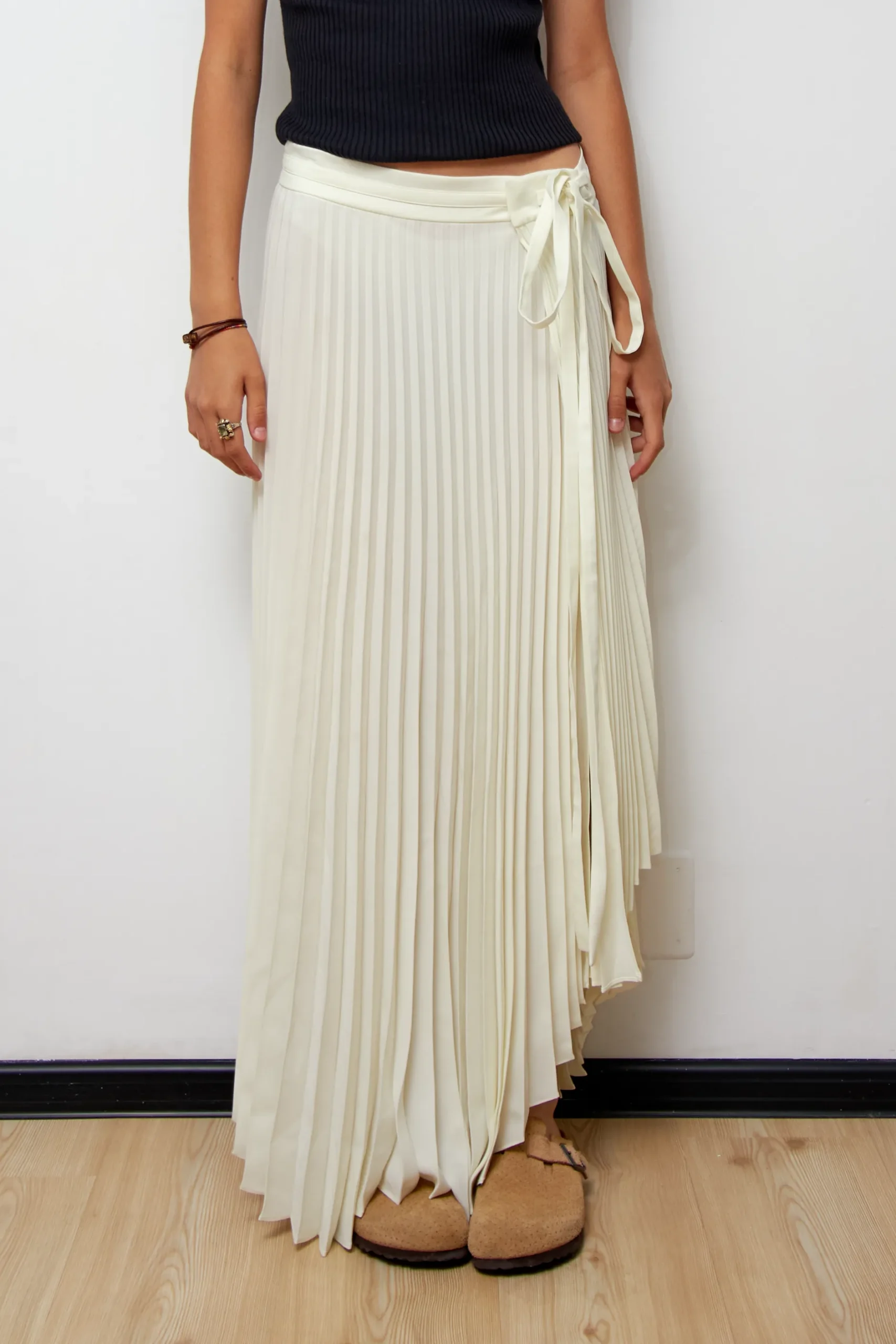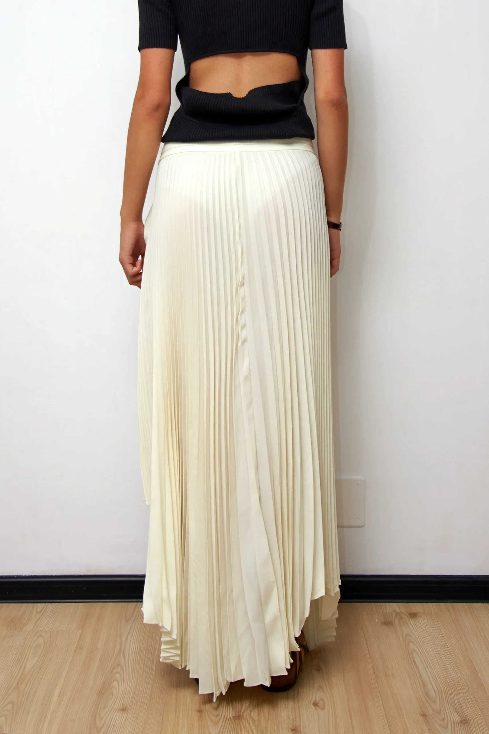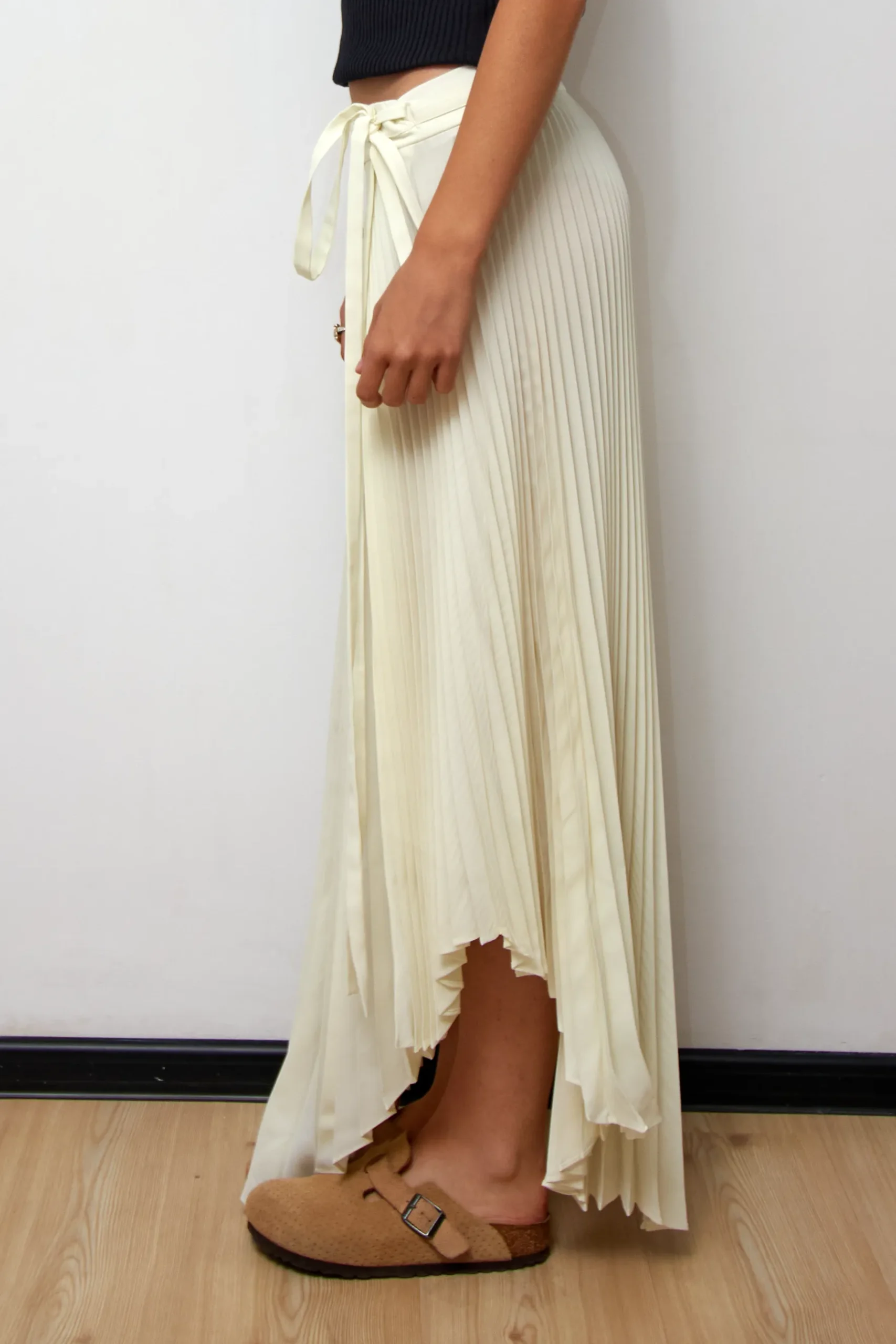 Adjustable pleated skirt in butter, 100% polyester, waist 78cm, length 98cm.