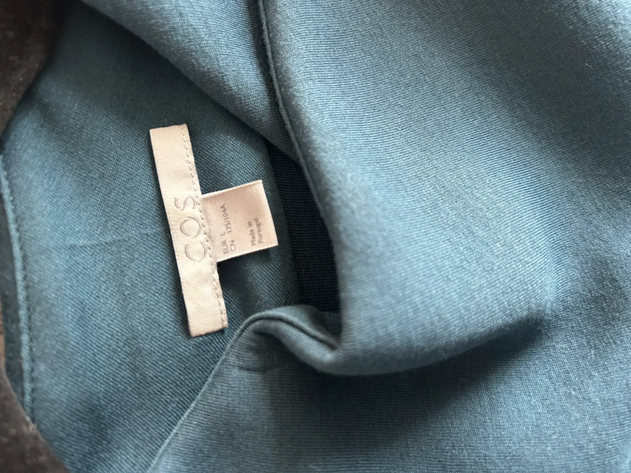 Minimalist dress in deep teal, in a structured, scuba-like fabric, asymetrical draped collar, long sleeves. 50% viscose, 50% polyester. Length 108cm, bust 120cm.