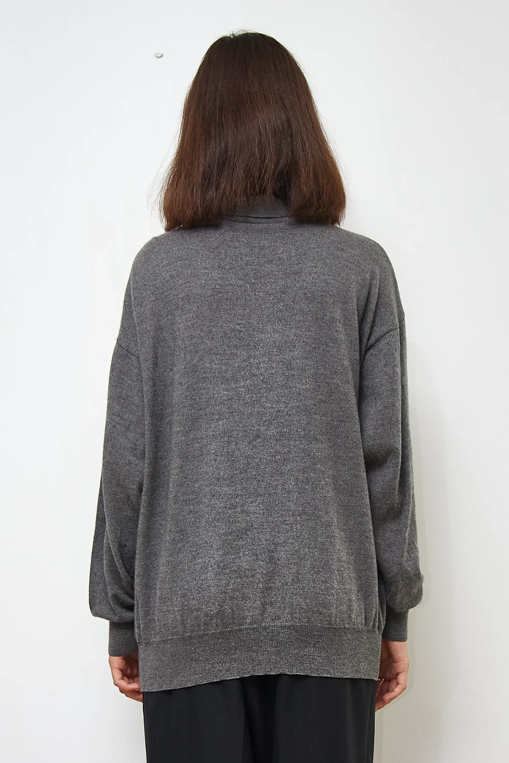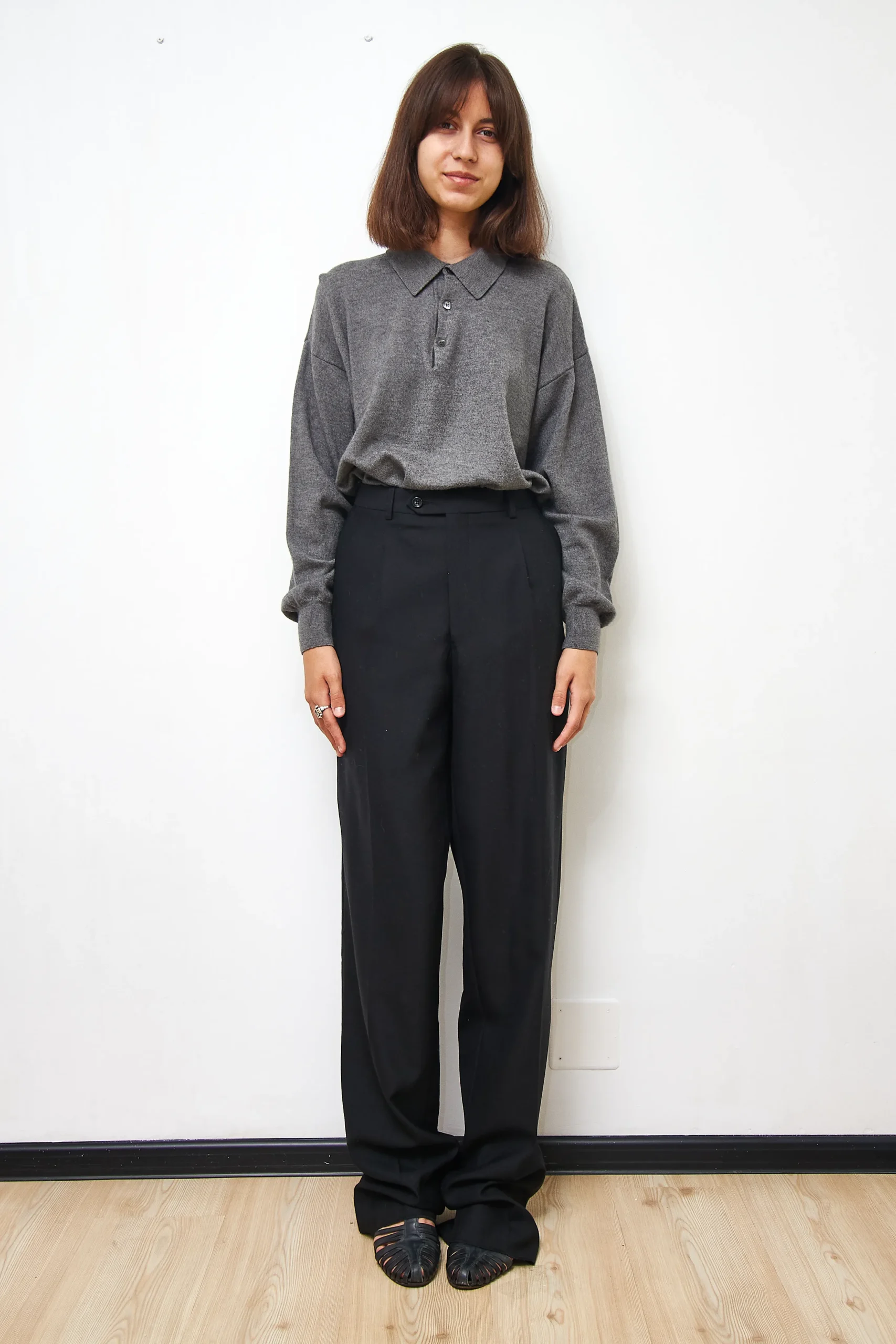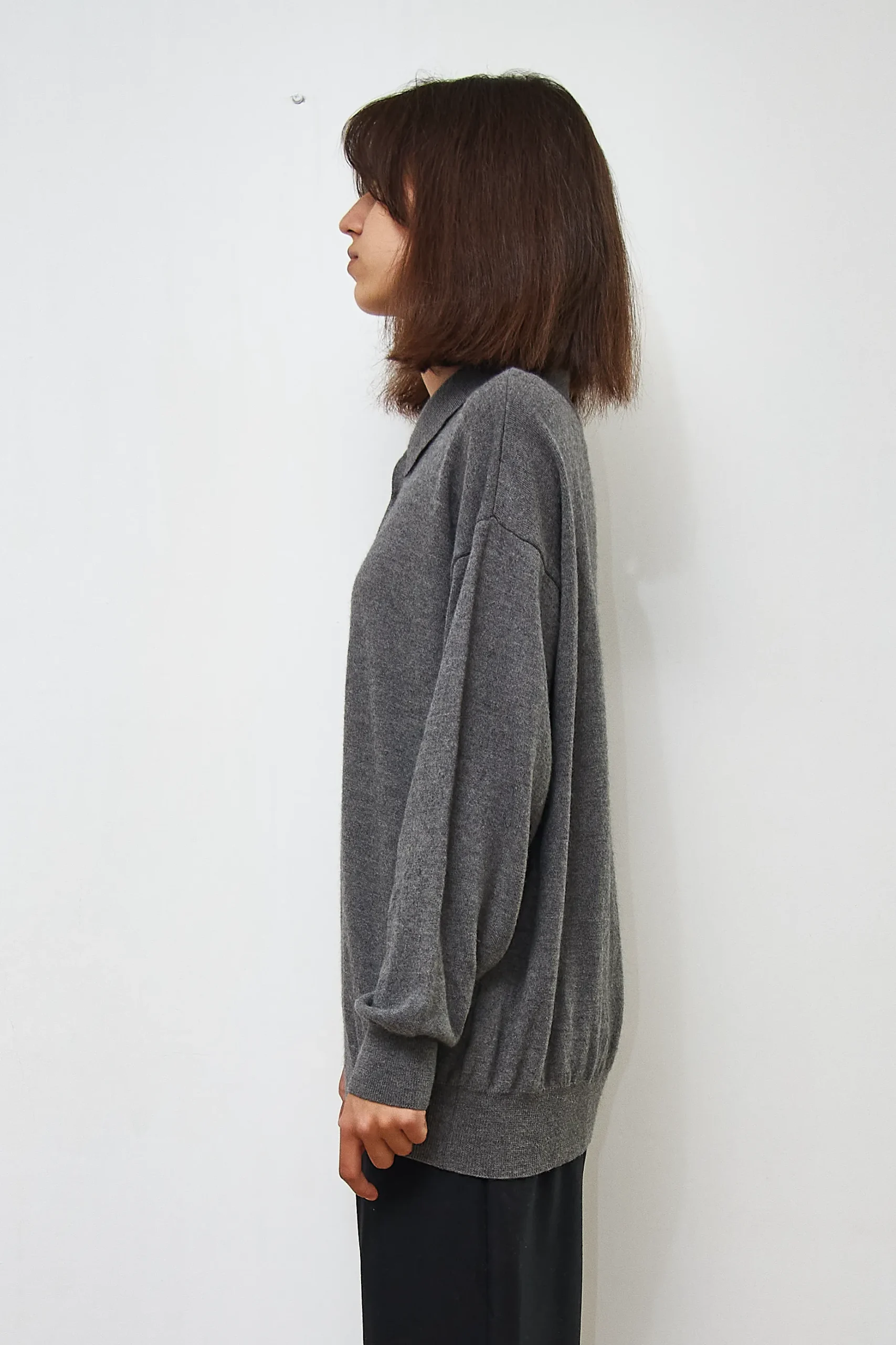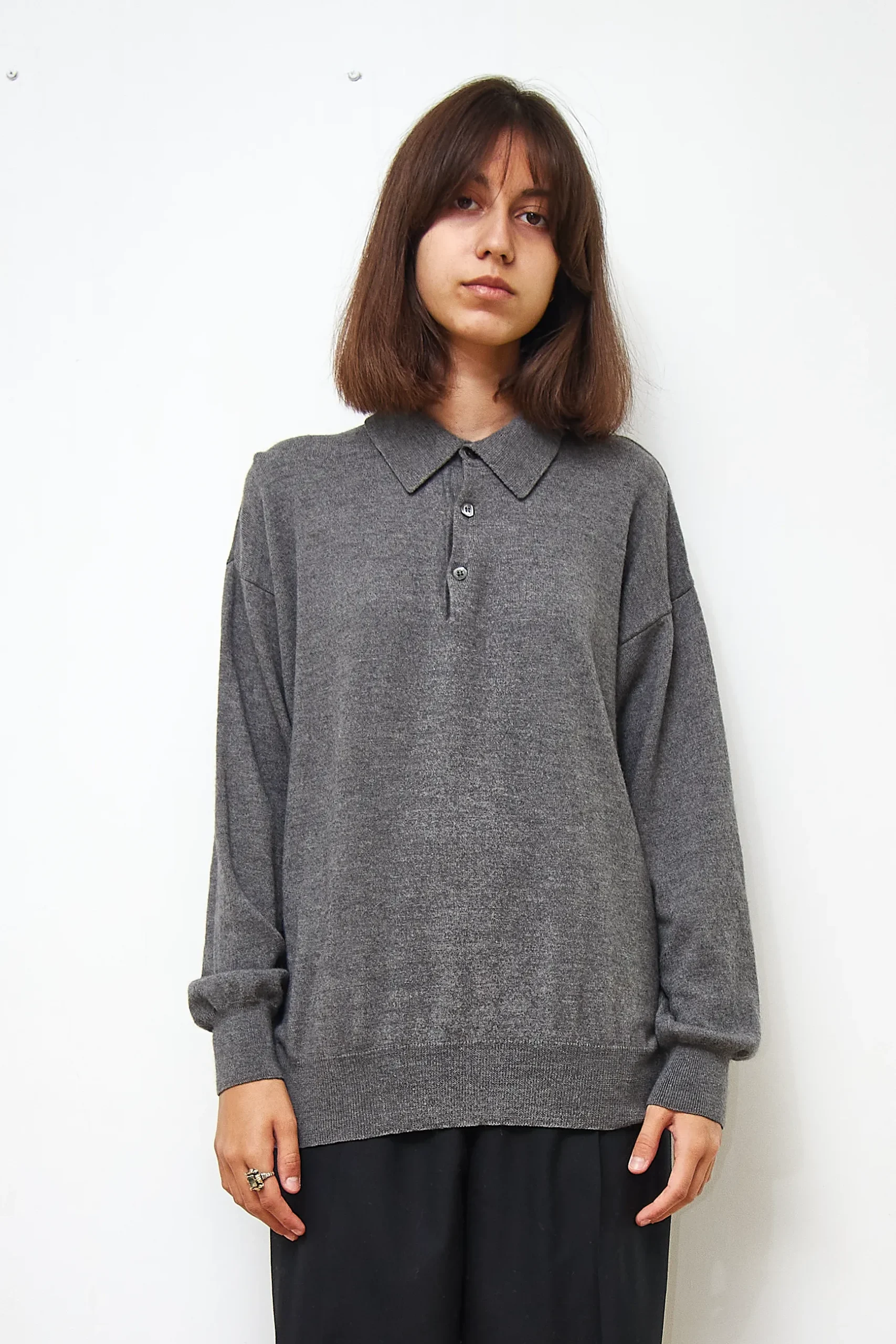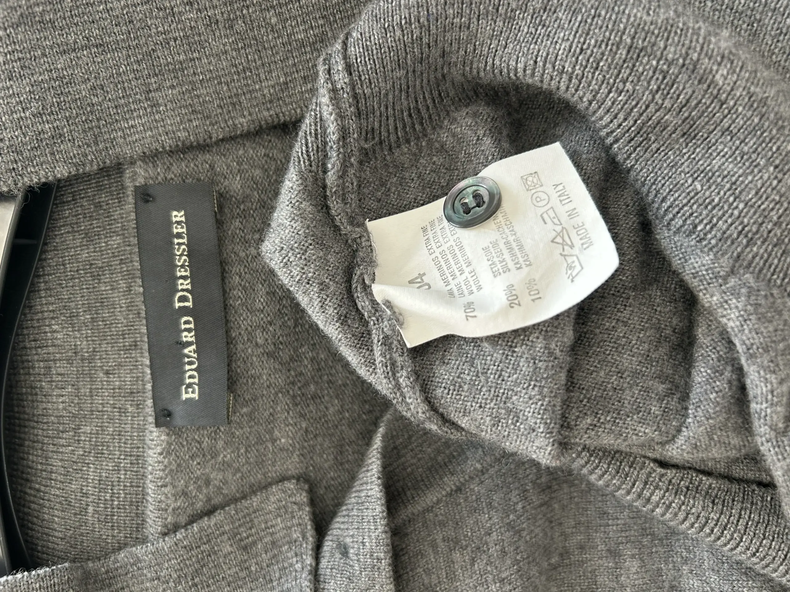 Eduard Dressler polo sweater in grey, 70% extrafine merino wool, 20% silk, 10% cashmere. Length 63cm, Bust 120cm.