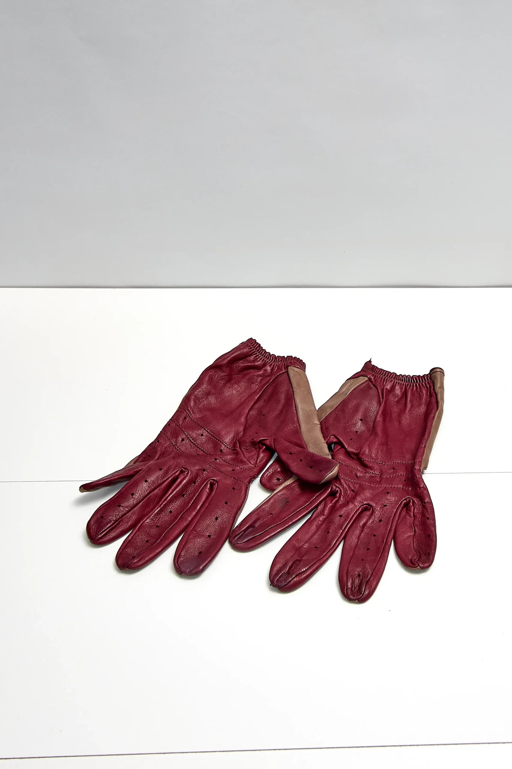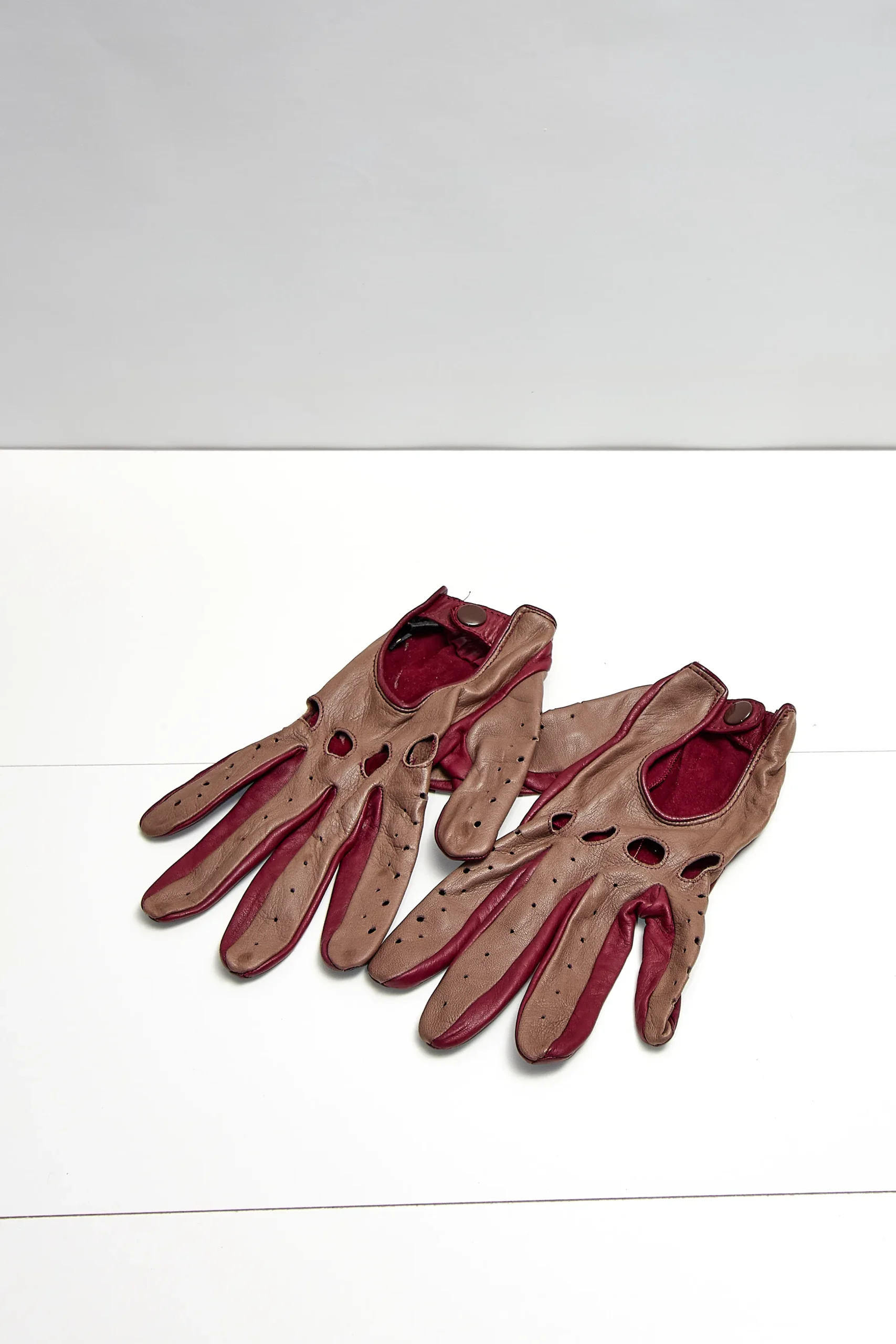 Leather driving gloves, Burgundy and beige, perforated, snap closure.