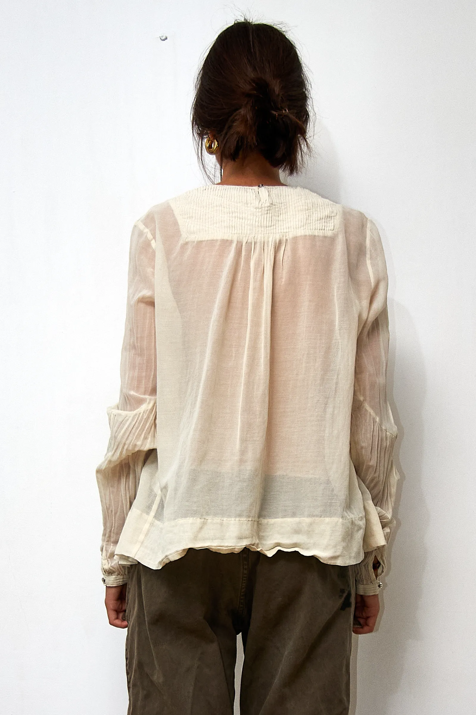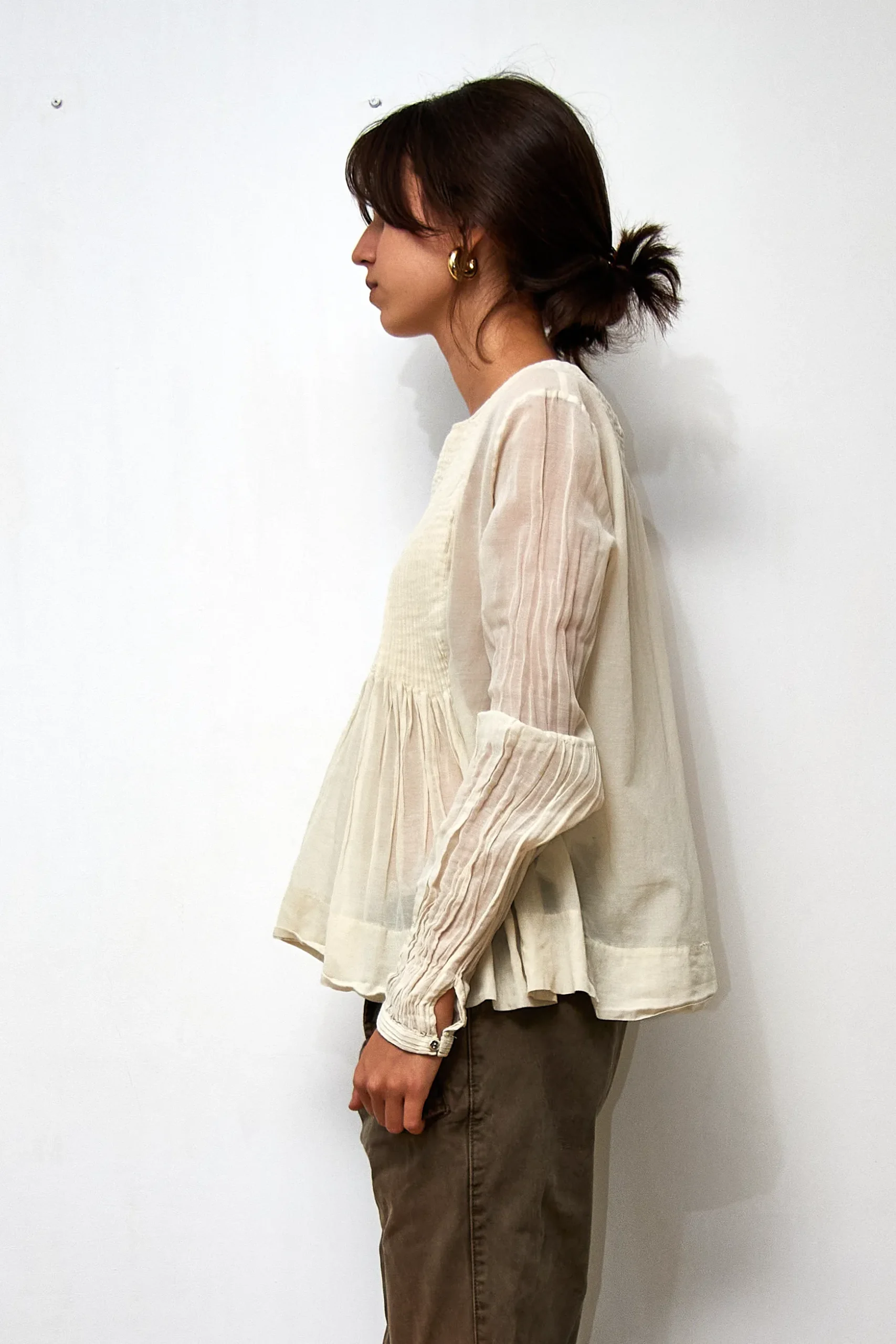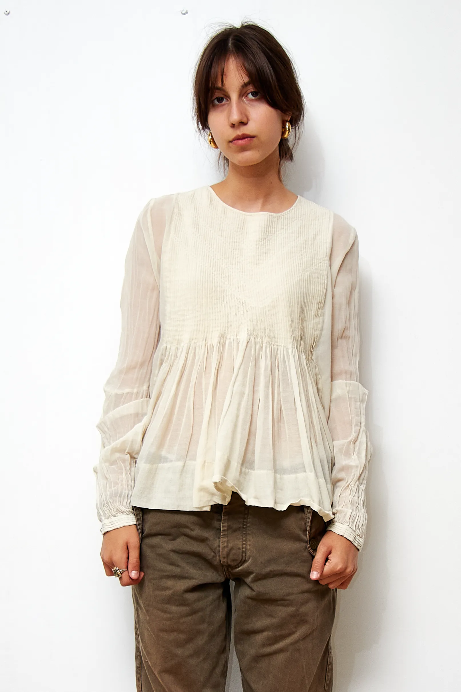 Pleated shirt in eggshell with a button closure at the back, 60% cotton, 40% silk, length 60cm, bust 100cm.