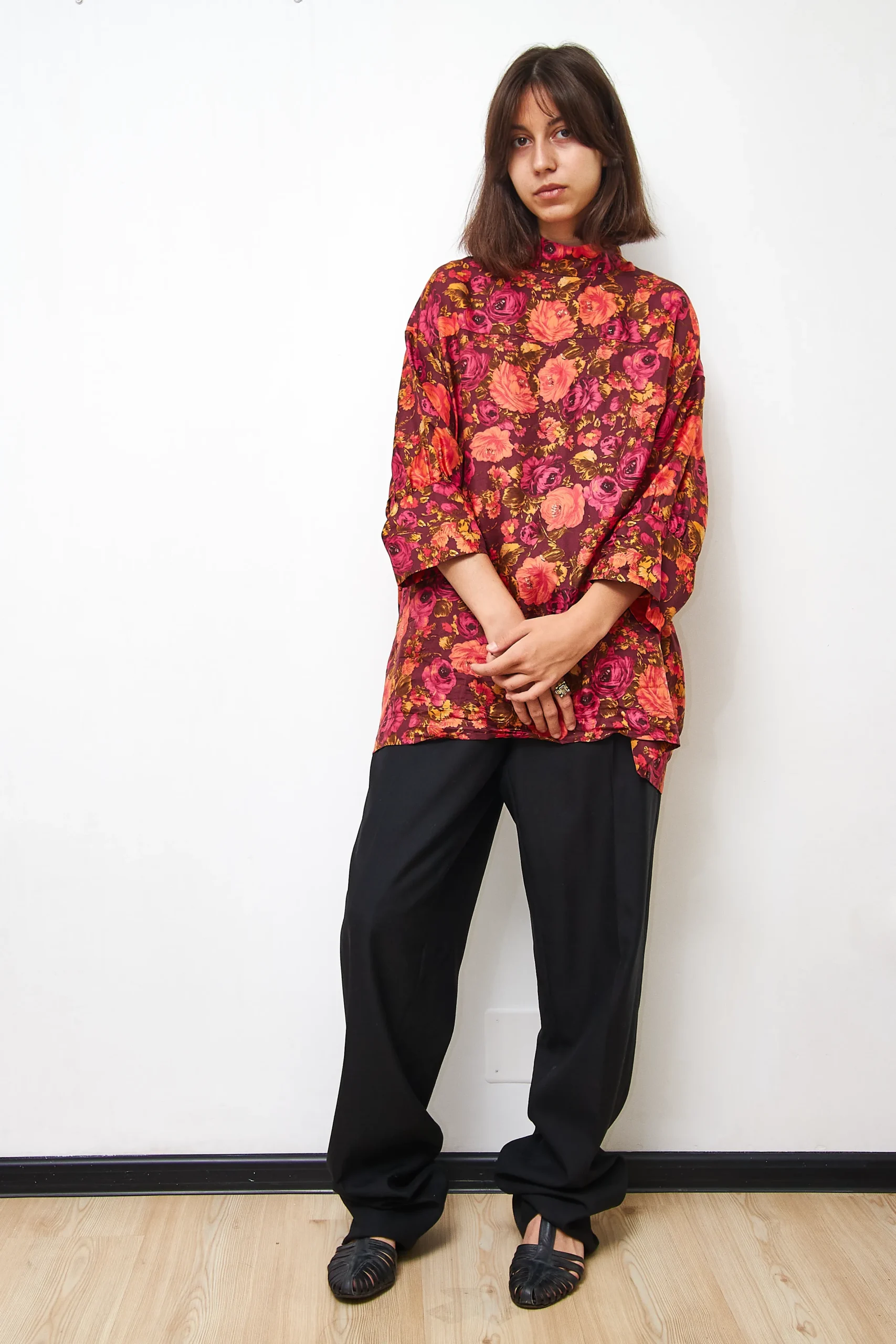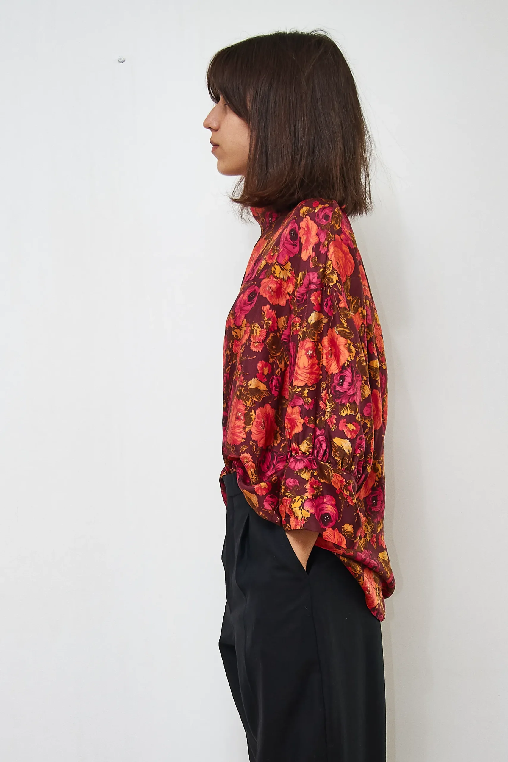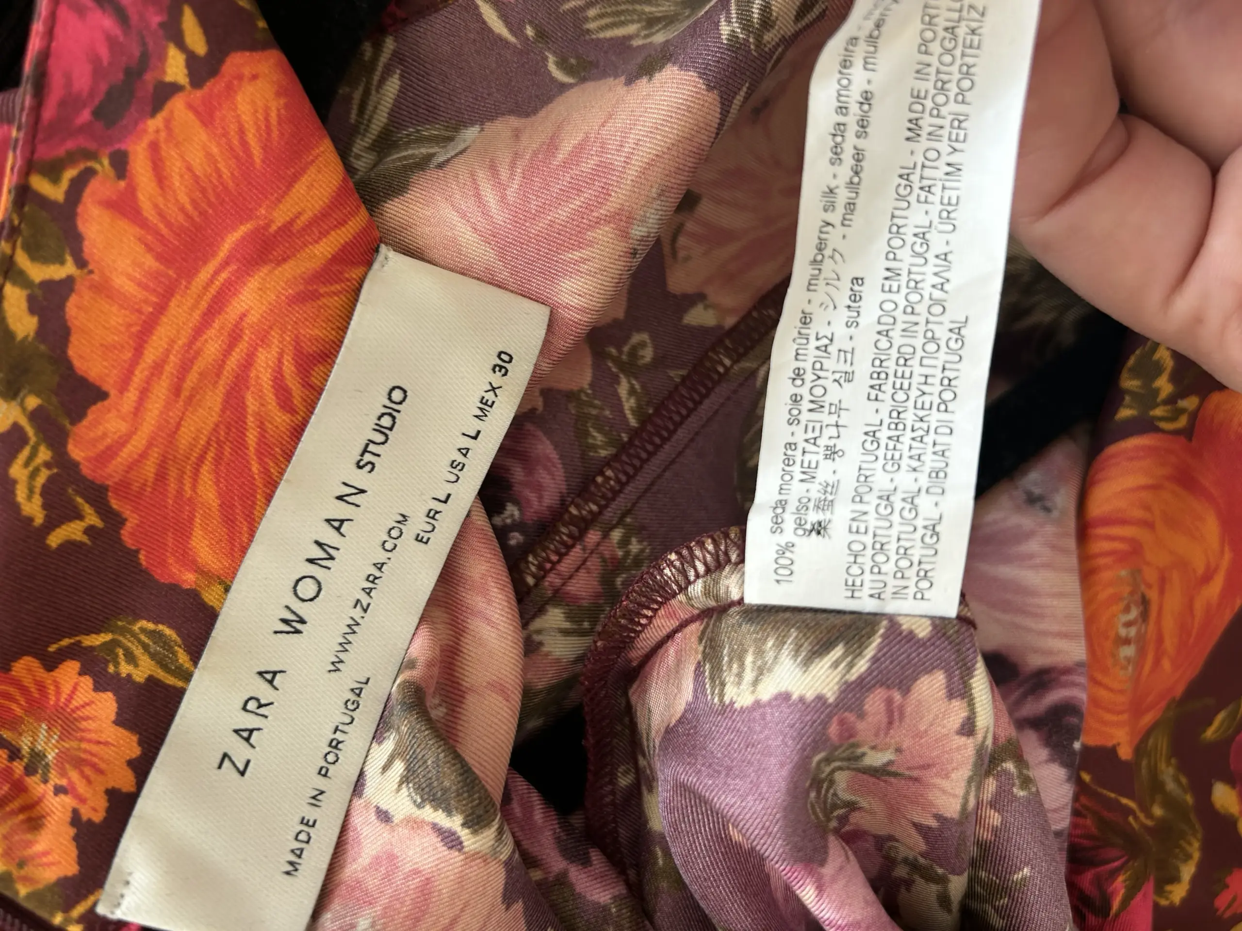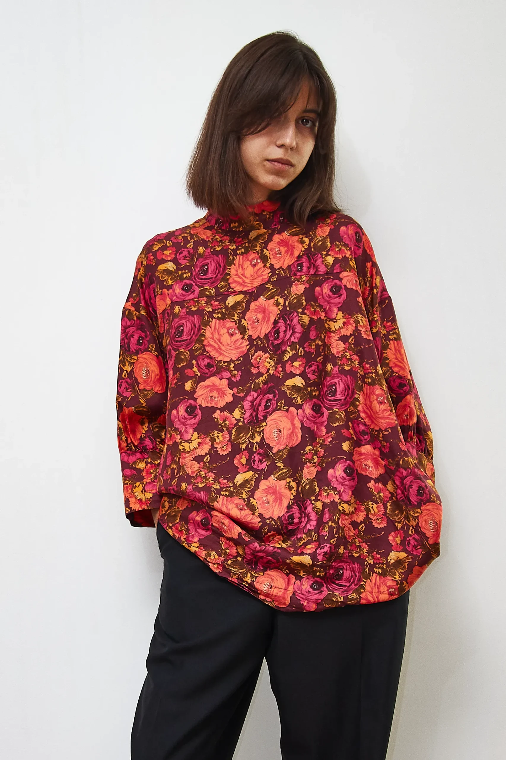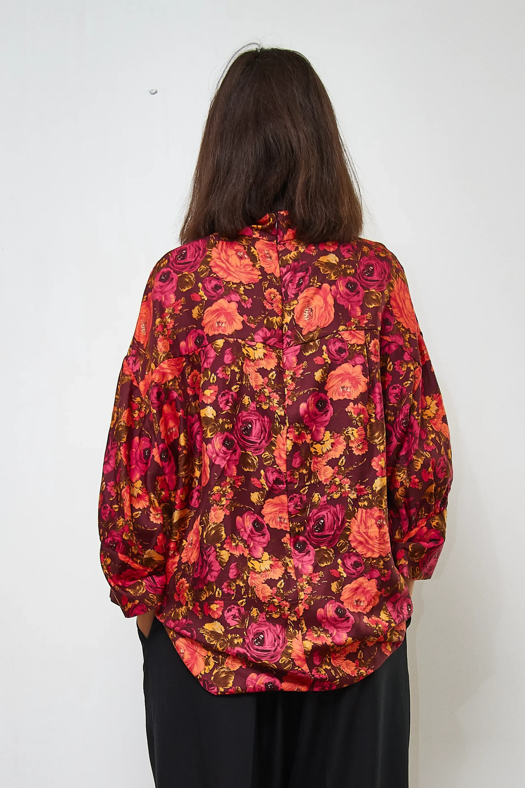 Silk shirt in a floral print, with zipper at the back. 100% silk. Length 73cm, Bust 130cm.