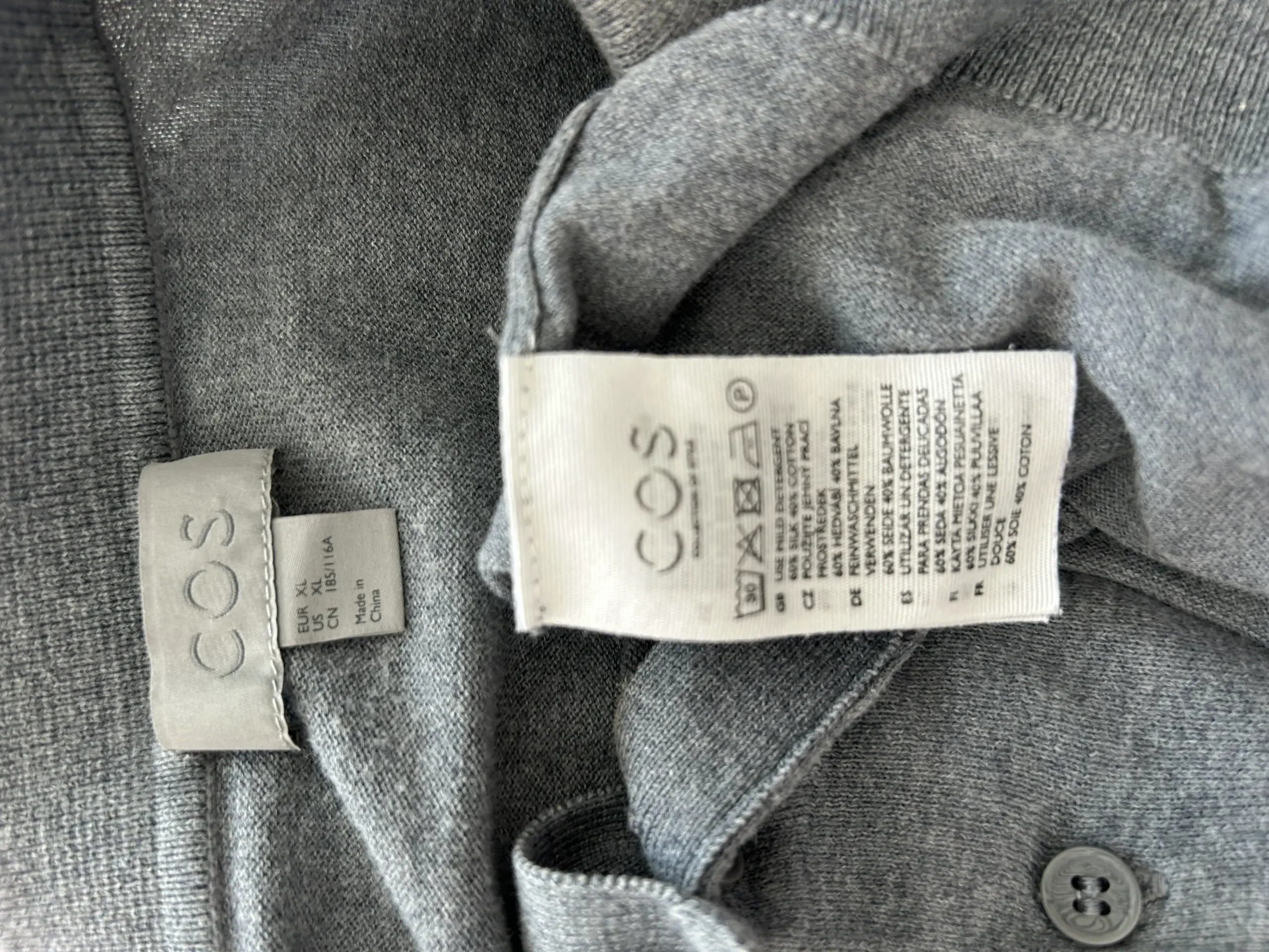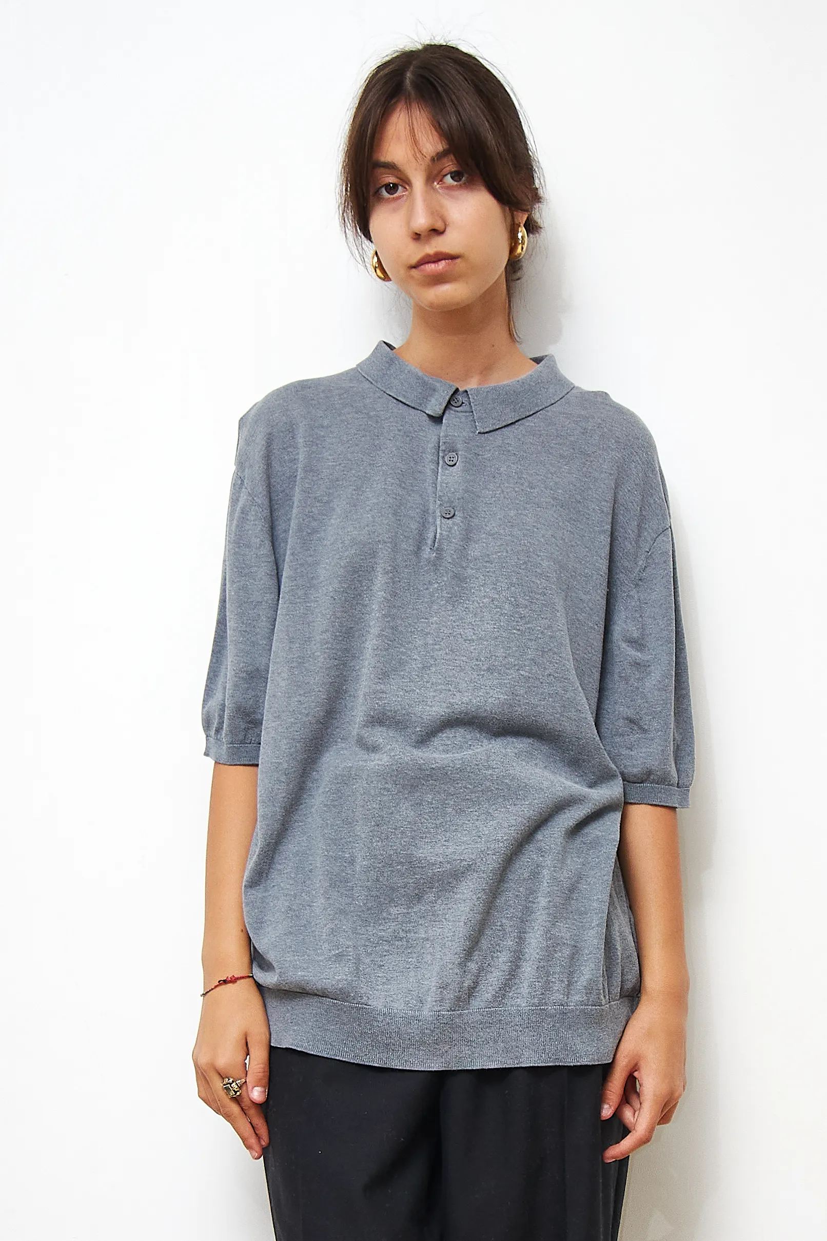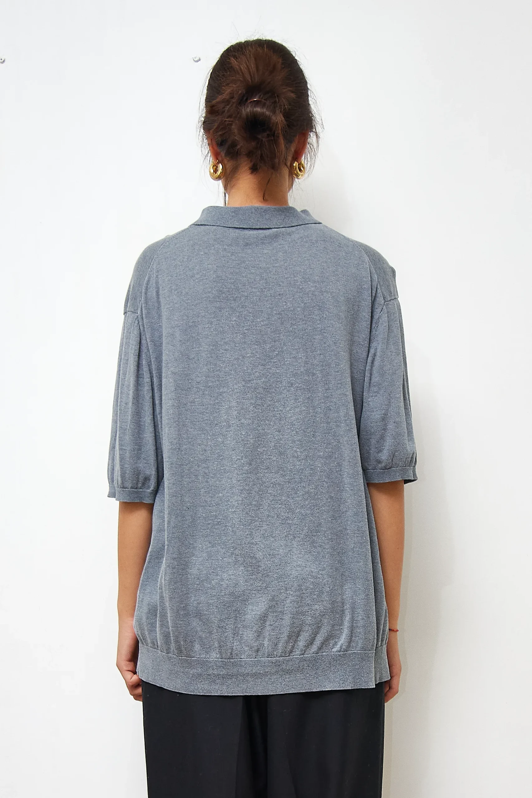 COS grey polo shirt in 60% silk and 40% cotton. Length 70cm, Bust 112cm.