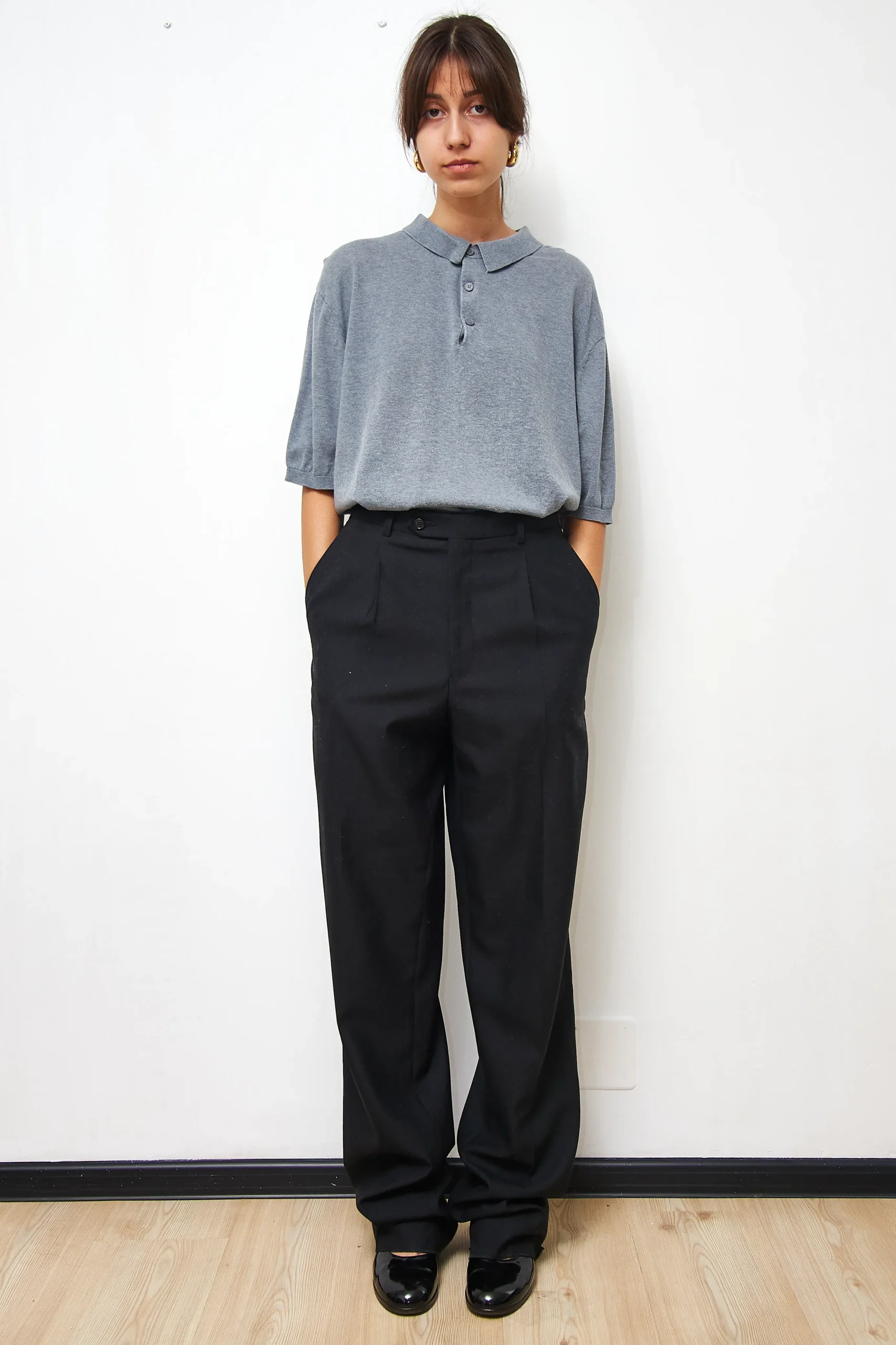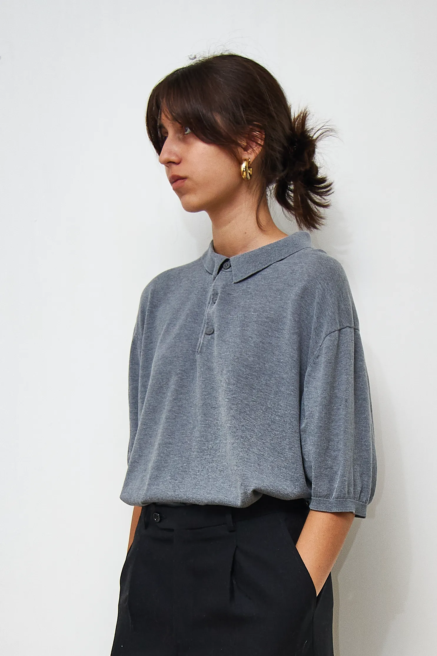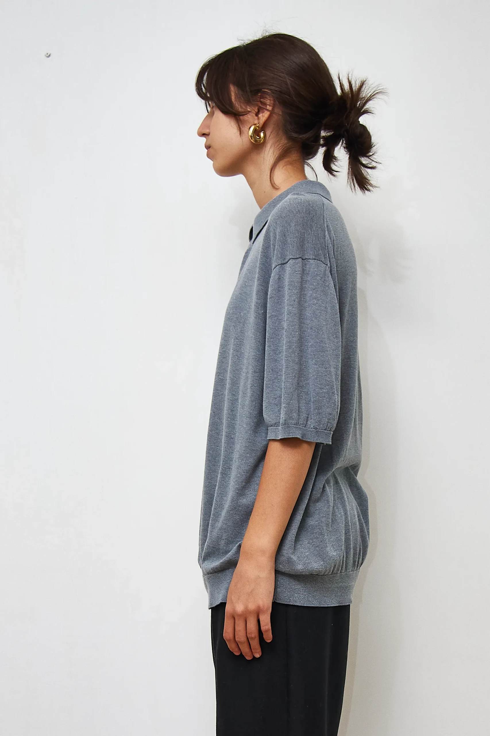 COS grey polo shirt in 60% silk and 40% cotton. Length 70cm, Bust 112cm.