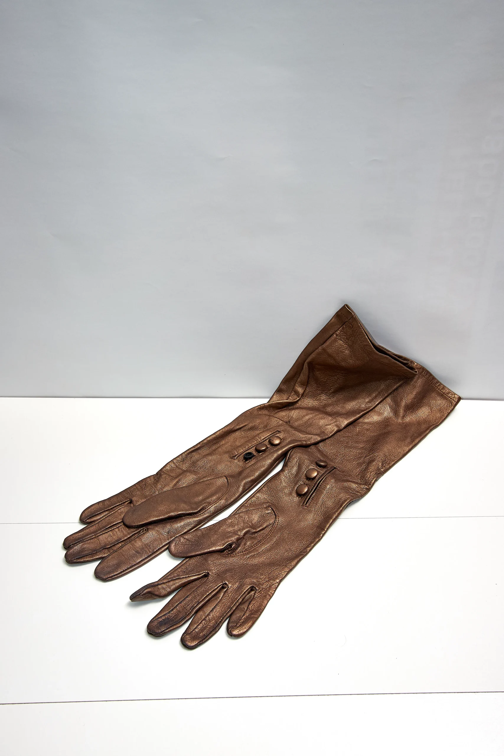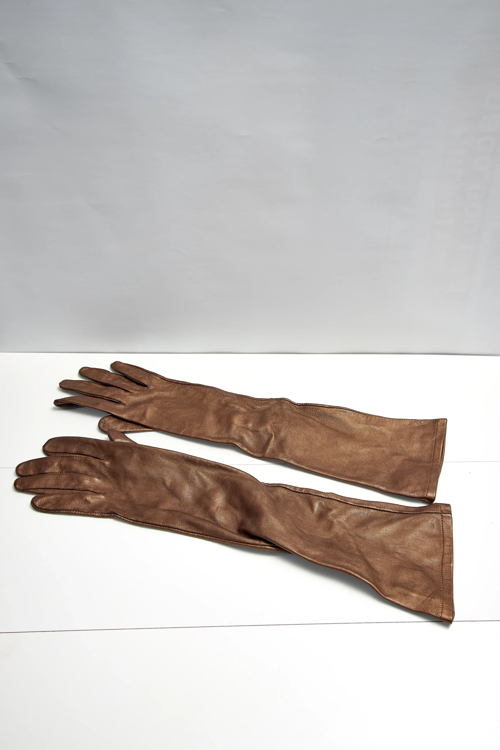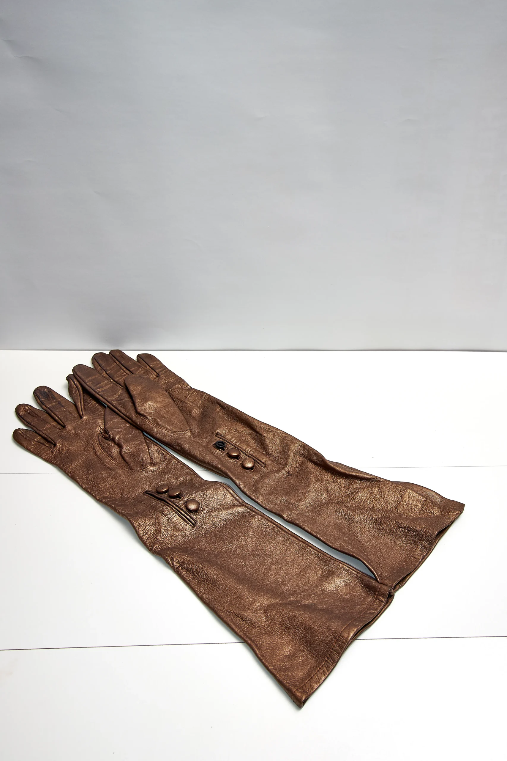 Long leather gloves in a pearlescent brown with buttons for easy glide. 45cm length.