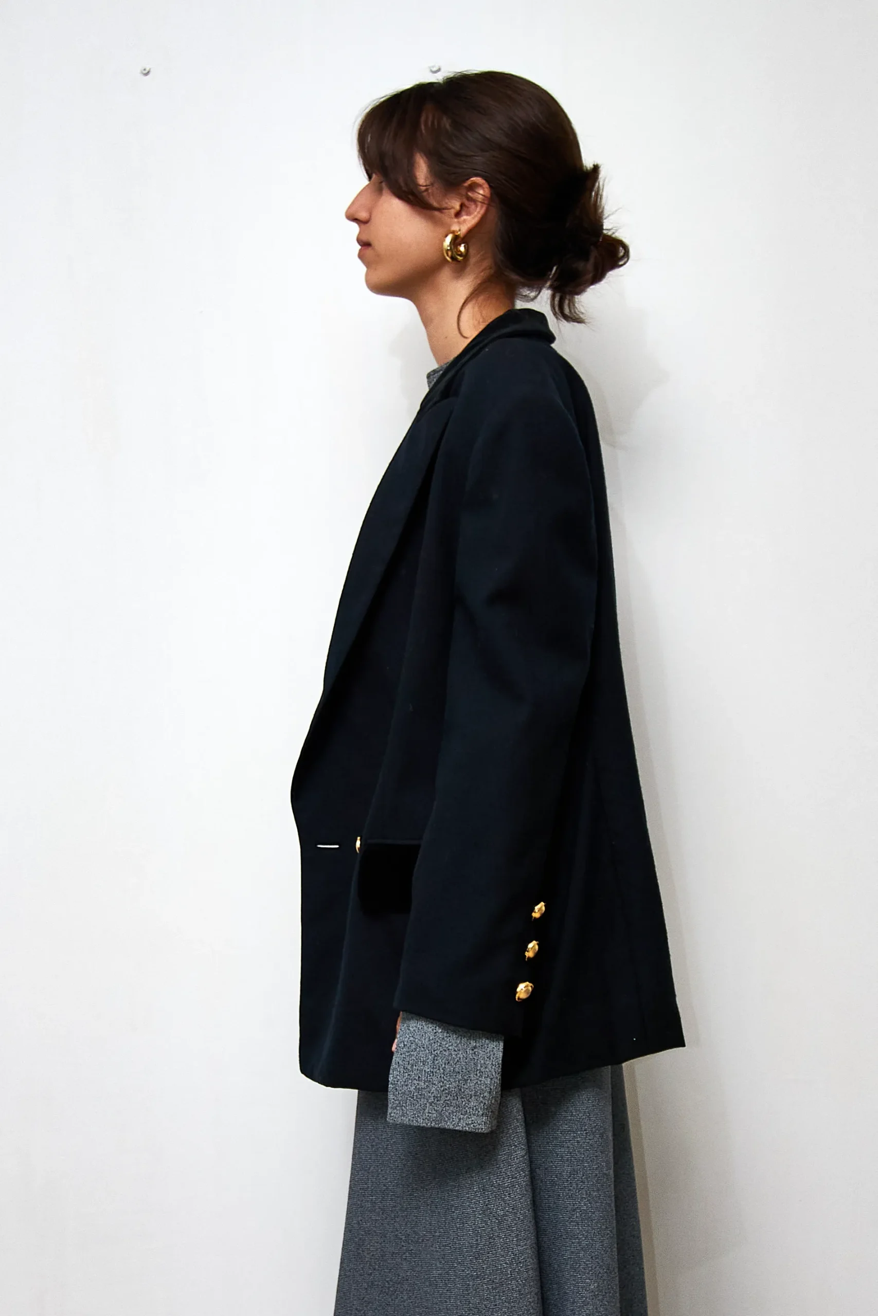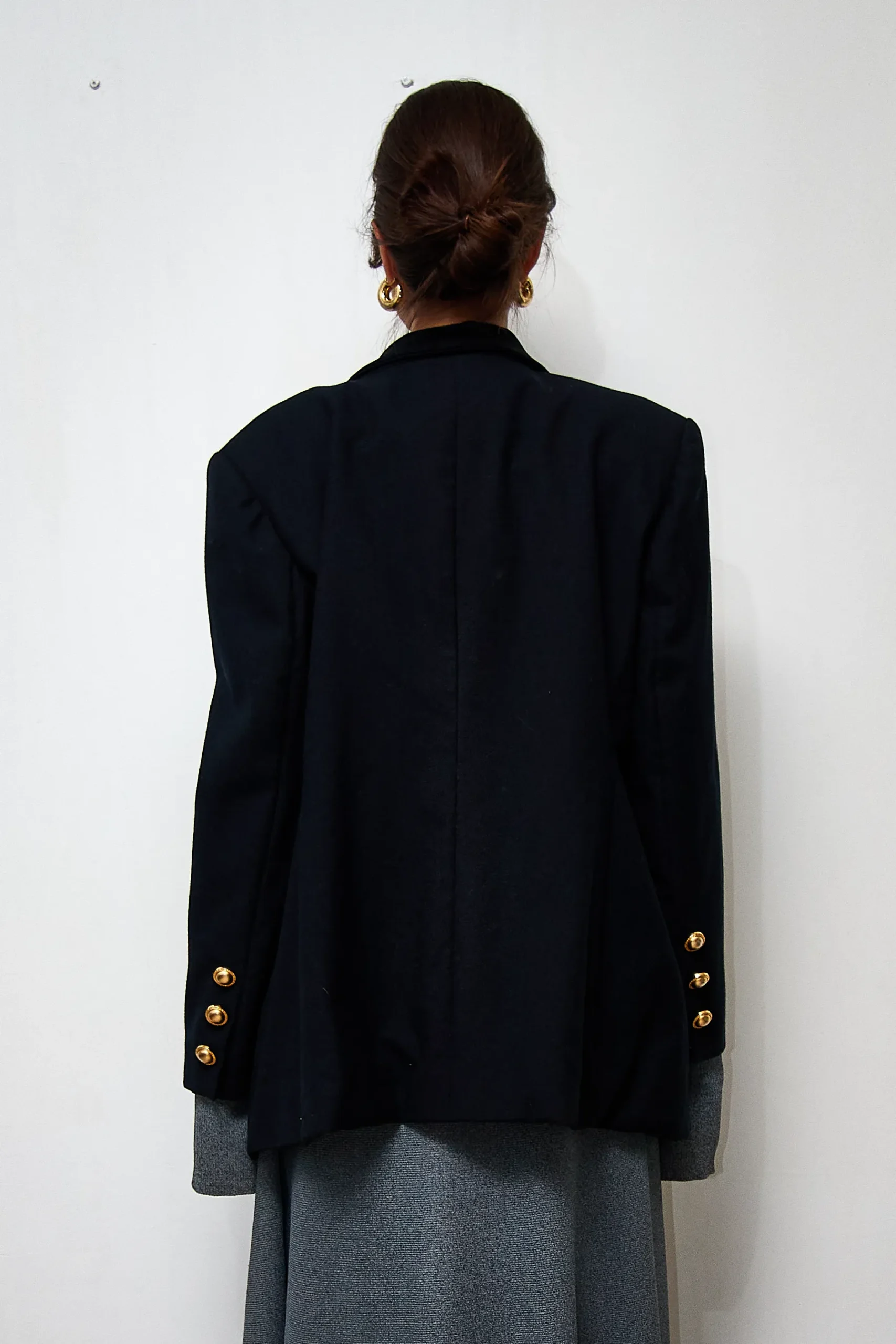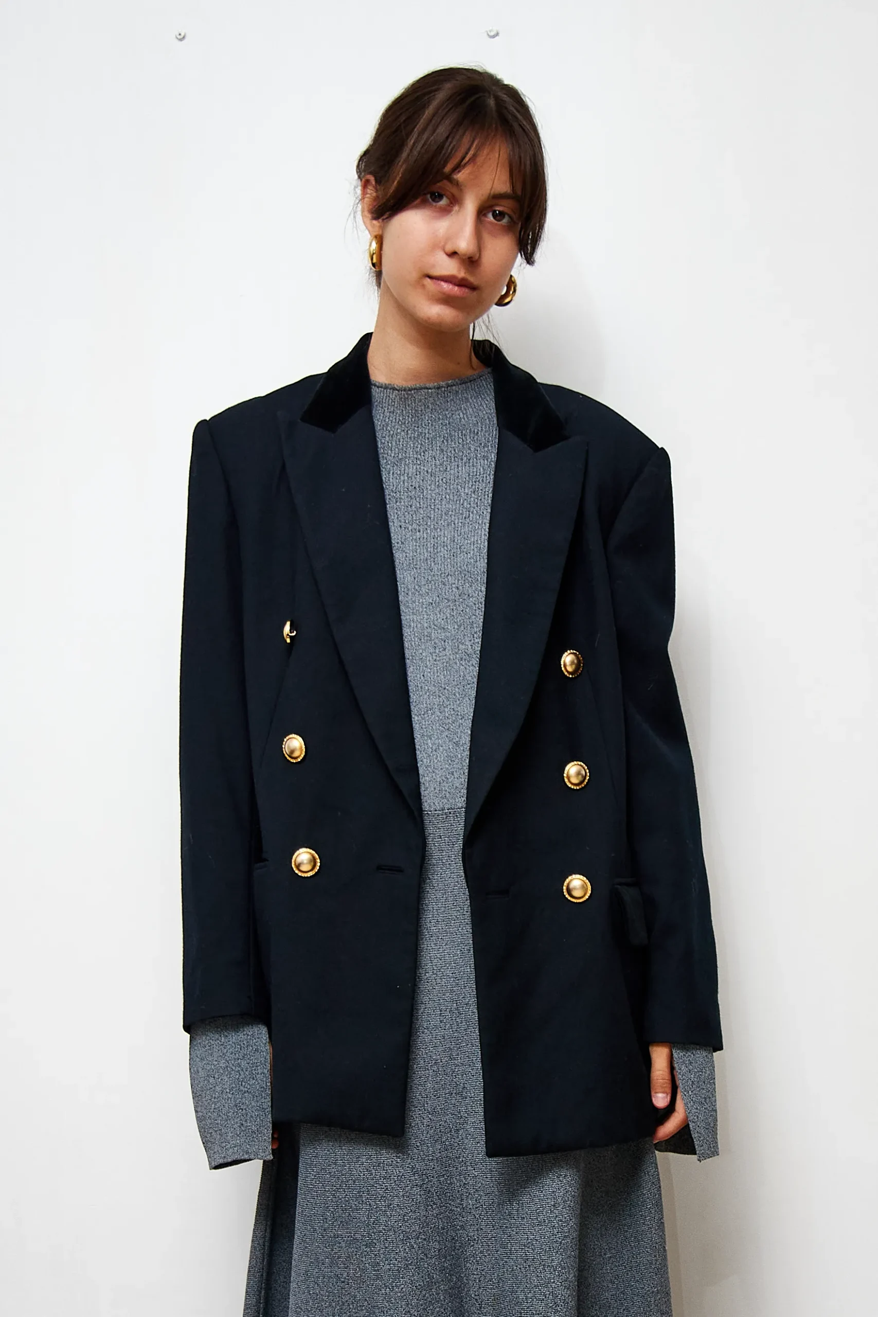 Vintage Valentino blazer in wool with velvet details and golden buttons. Length 68cm, shoulder to shoulder 46cm. Small defect: 2 tiny holes in the left sleeve, which have been repaired.