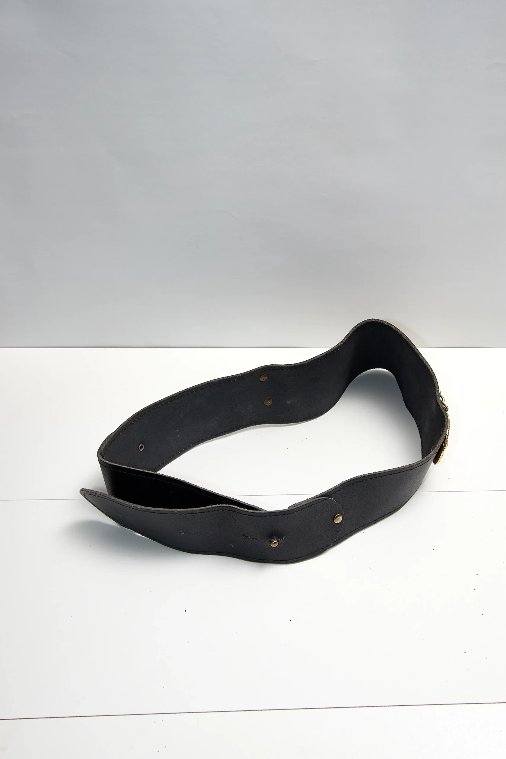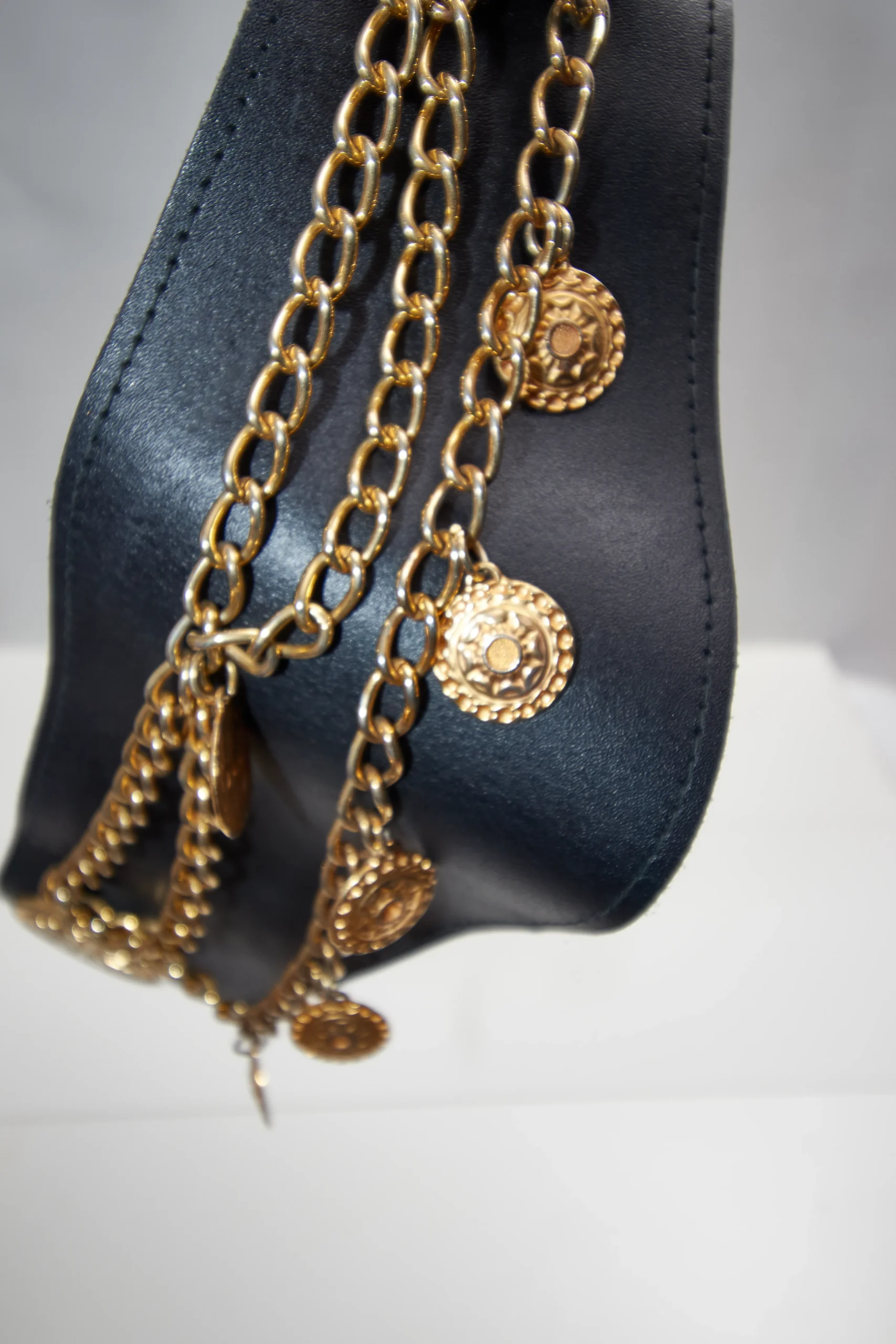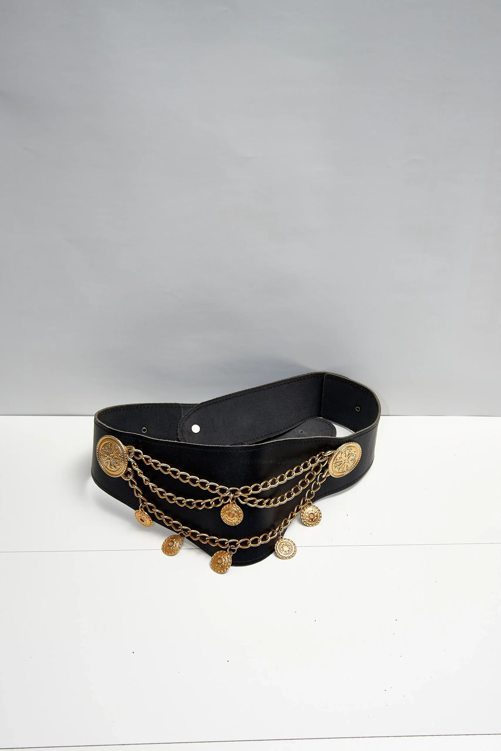 Black Faux Leather Belt with gold tone medallion chains and decorative coin-like accents. 90cm long, 6cm to 11 cm wide in the front.
