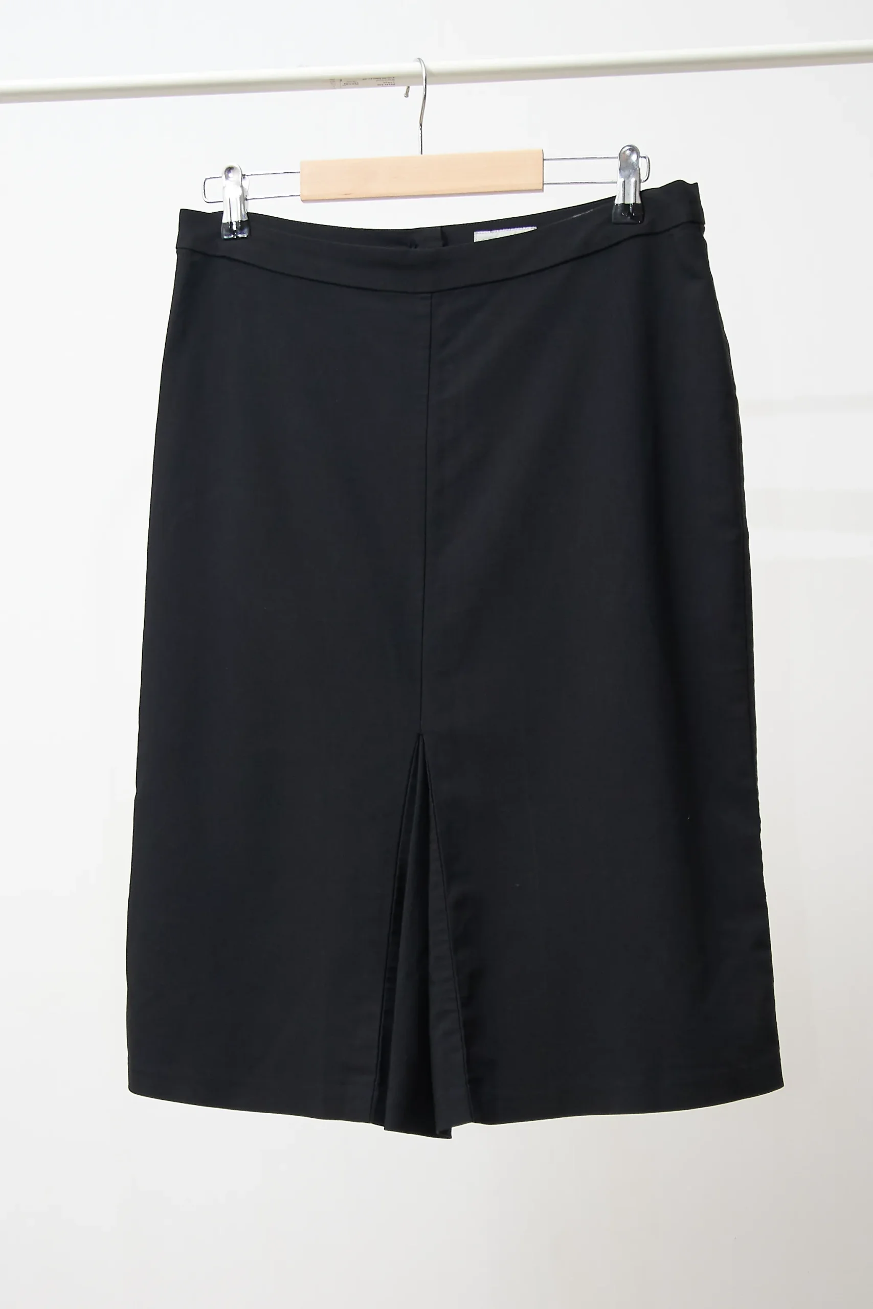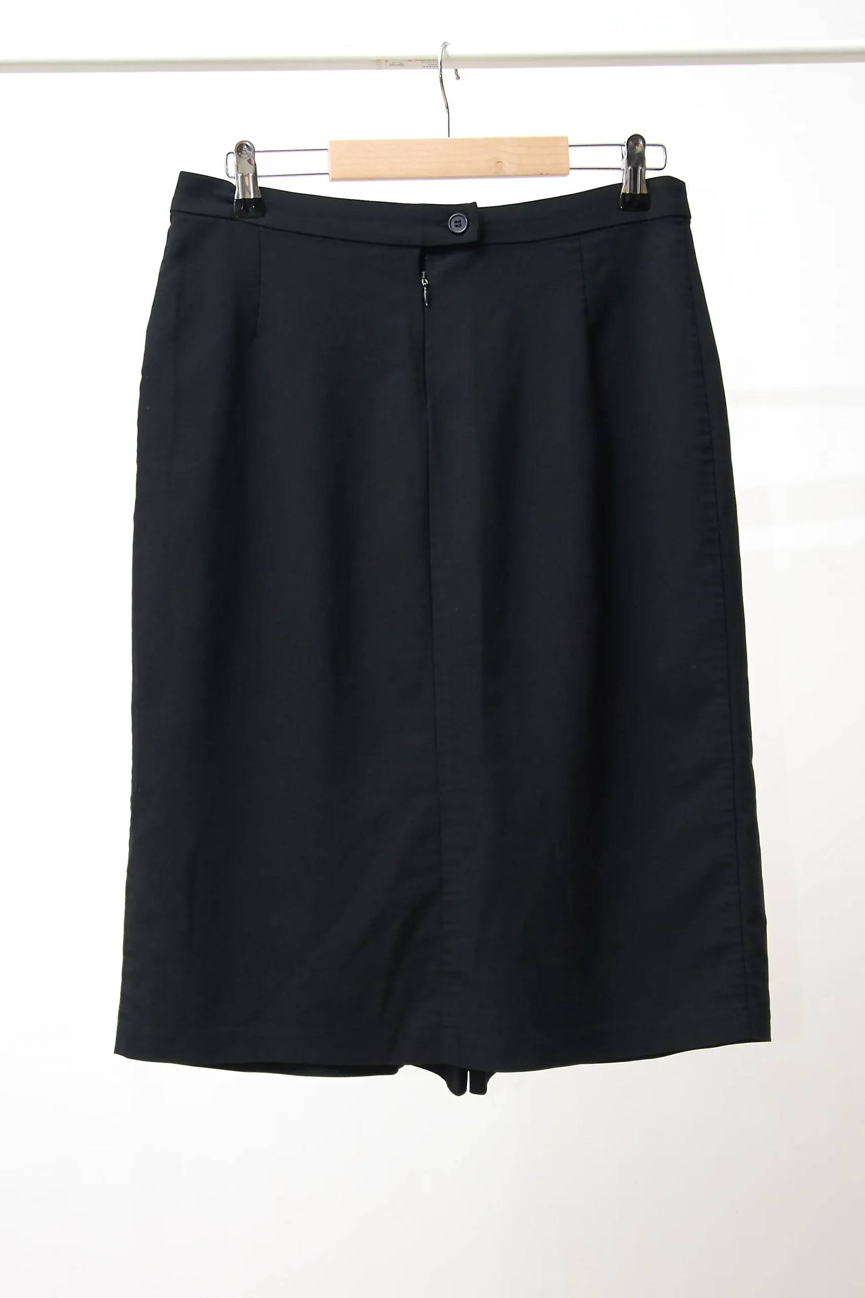Vintage black skirt, no inside tags, most likely cotton and elastane blend, with a zip closure at the back. Waist: 44cm max, length 64cm.