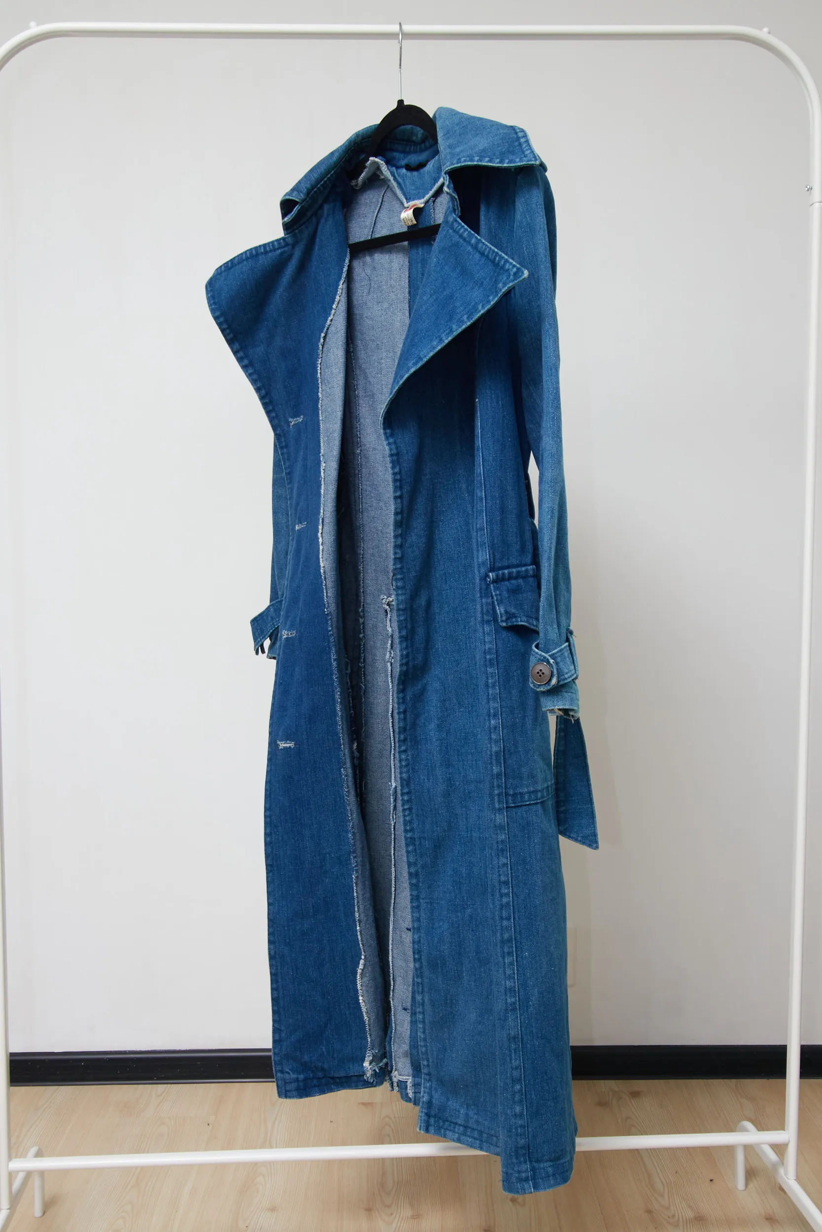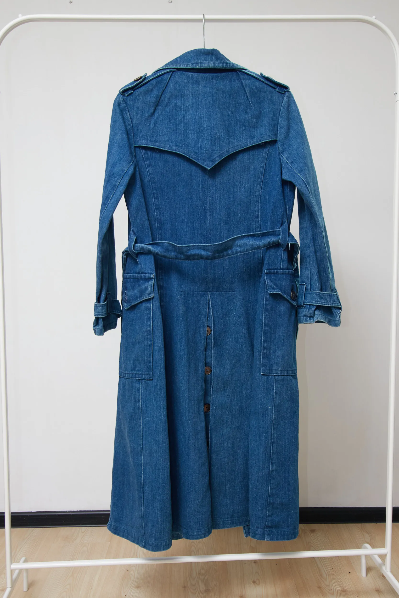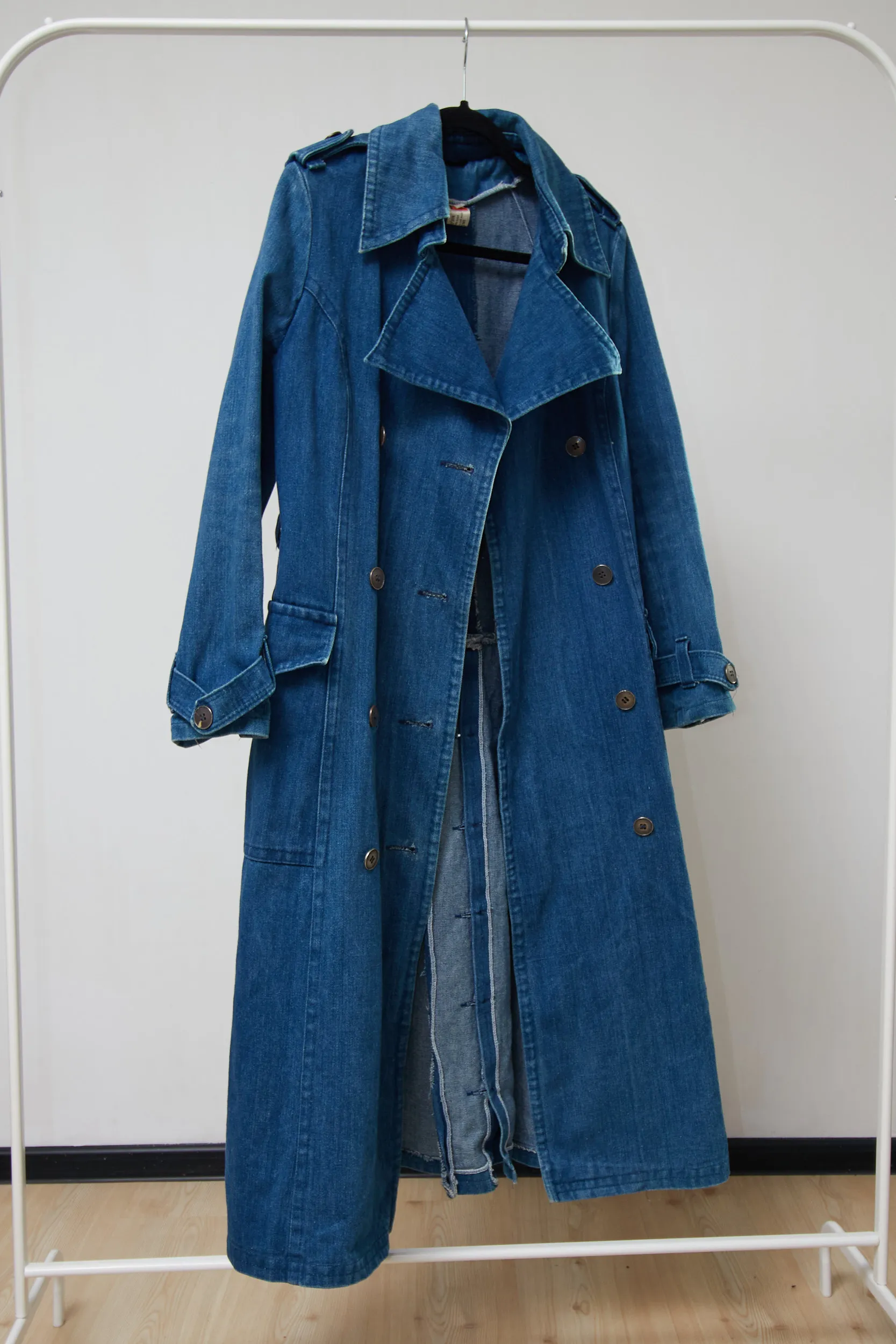 Vintage denim trench double breasted with large front pockets. 100% cotton. Length 114cm.
