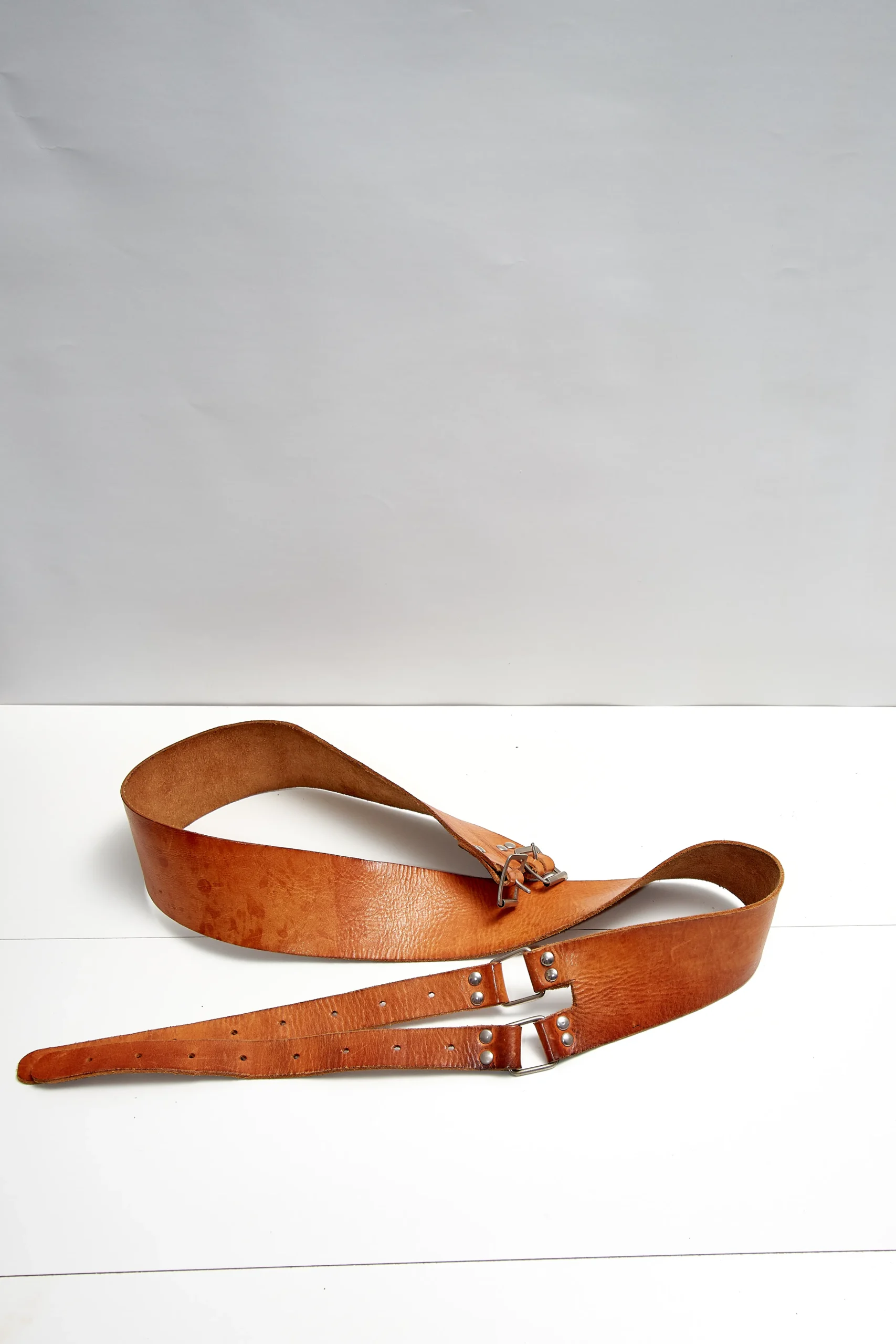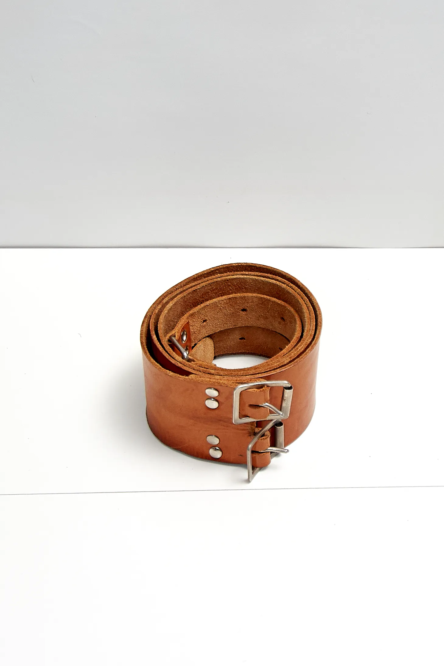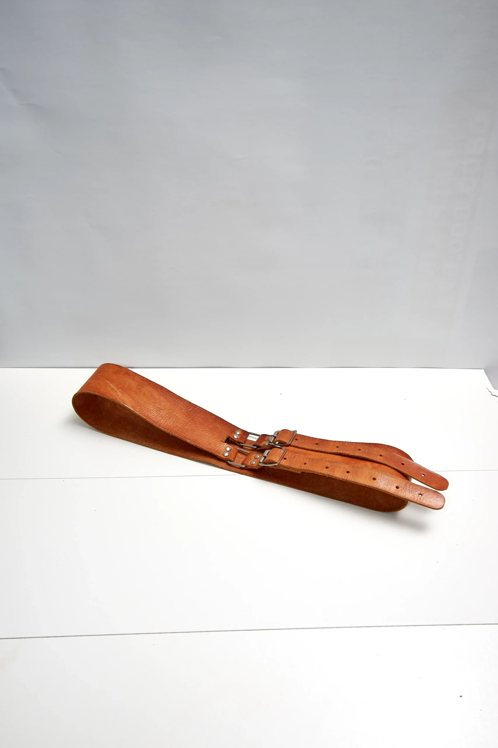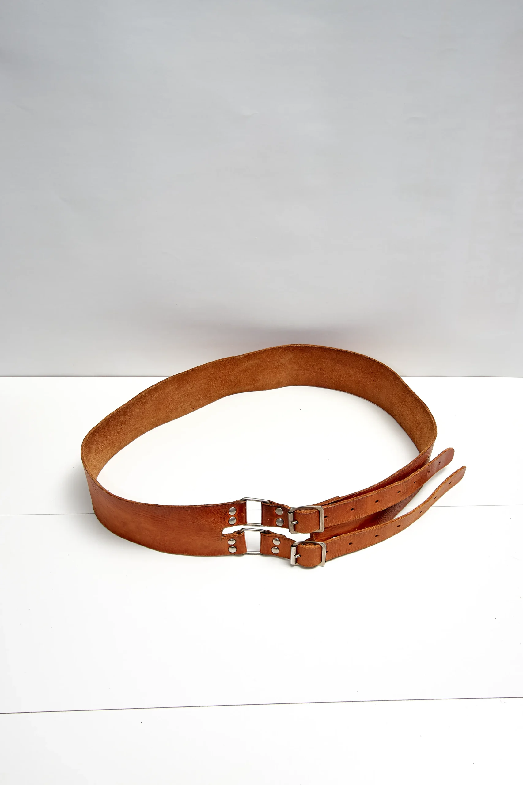 Vintage leather belt featuring dual buckle closure and multiple adjustment holes. Length 110cm, 5,5cm wide.