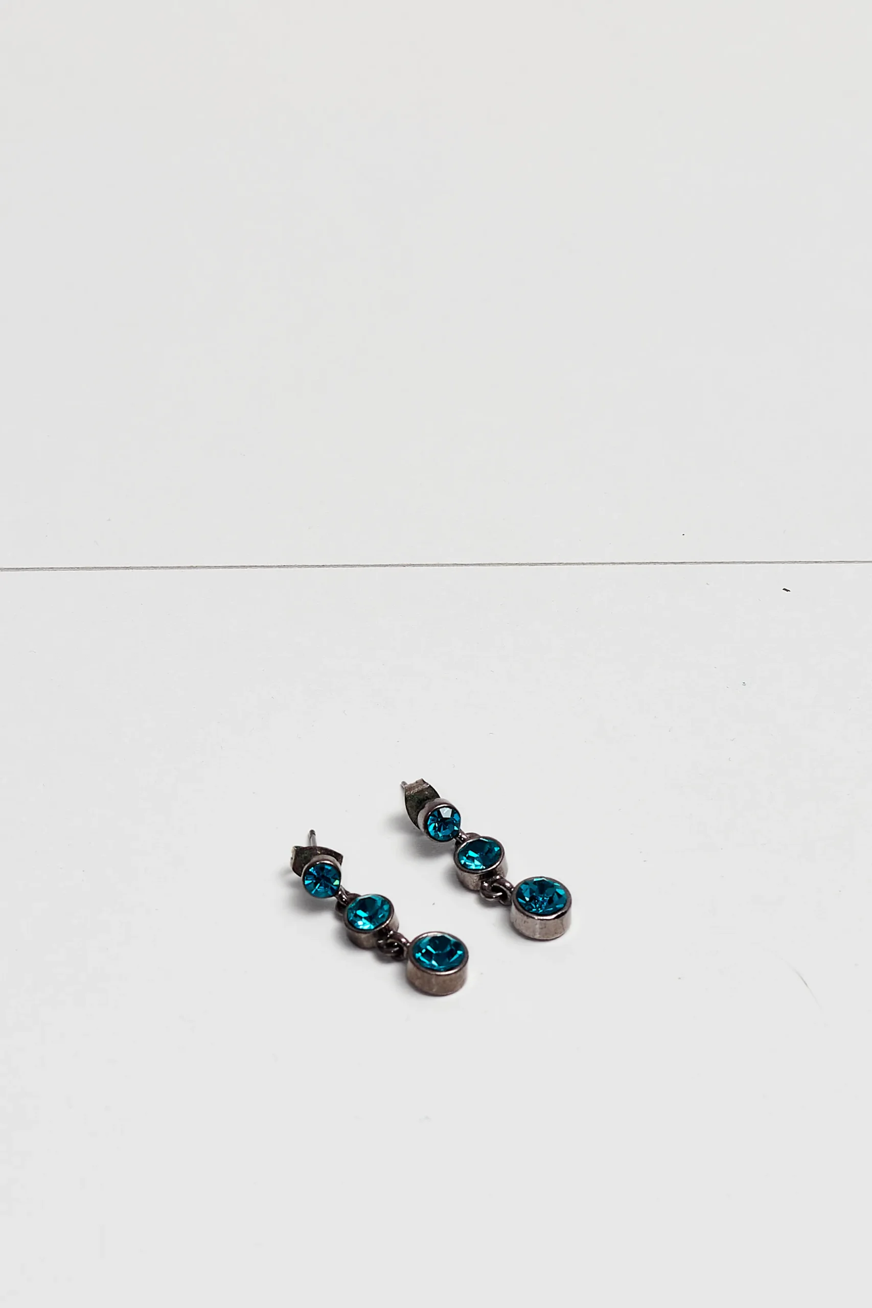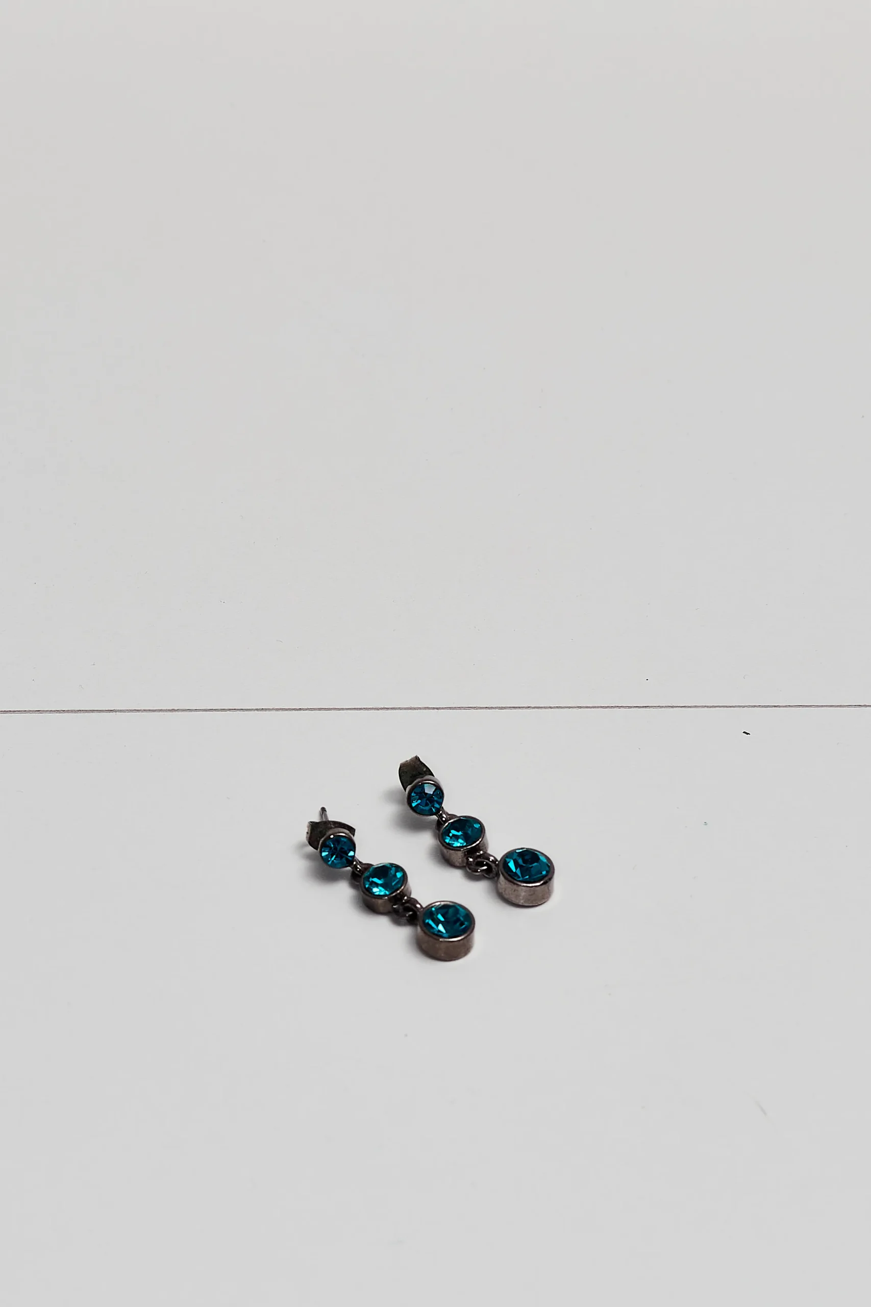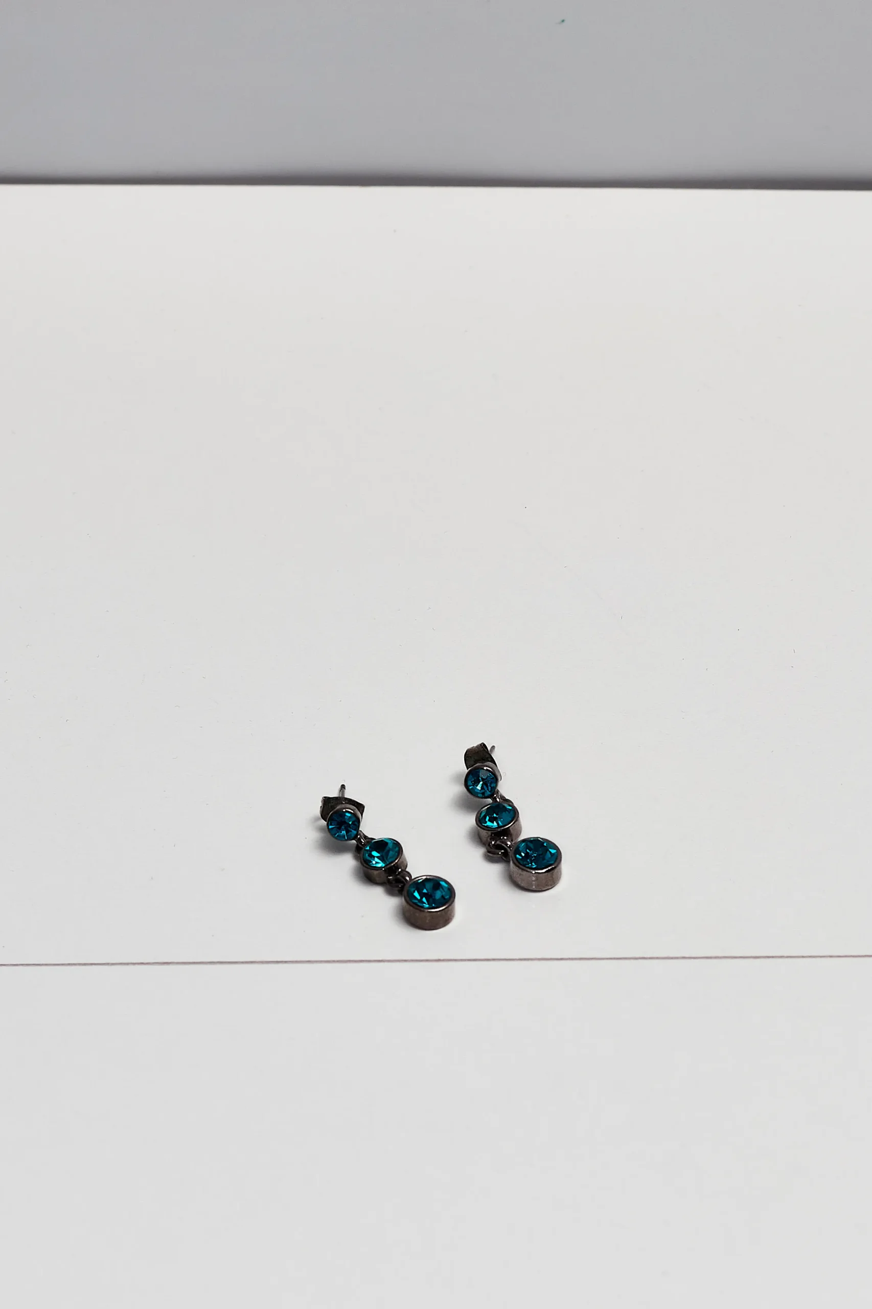 Linear drop earings with hematite finish and vibrant teal rhinestones, 3cm long